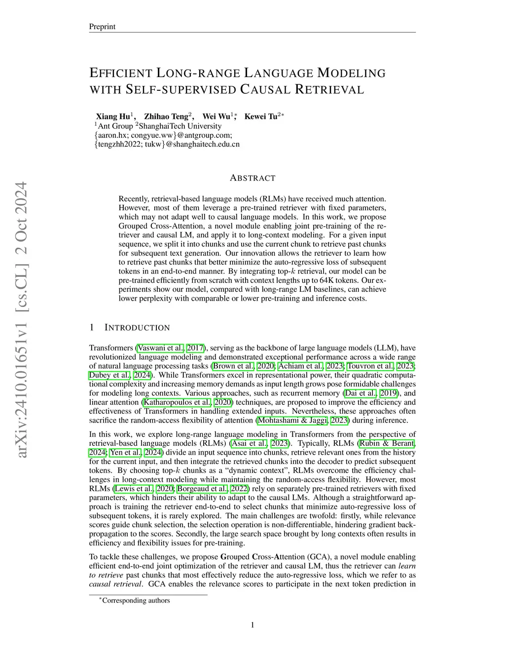 Despite the success of Transformers, handling long contexts remains challenging due to the limited length generalization and quadratic complexity of self-attention. Thus Transformers often require post-training with a larger attention window, significantly increasing computational and memory costs. In this paper, we propose a novel attention mechanism based on dynamic context, Grouped Cross Attention (GCA), which can generalize to 1000 times the pre-training context length while maintaining the ability to access distant information with a constant attention window size. For a given input sequence, we split it into chunks and use each chunk to retrieve top-k relevant past chunks for subsequent text generation. Specifically, unlike most previous works that use an off-the-shelf retriever, our key innovation allows the retriever to learn how to retrieve past chunks that better minimize the auto-regressive loss of subsequent tokens in an end-to-end manner. Such a mechanism accommodates retrieved chunks with a fixed-size attention window to achieve long-range information access, significantly reducing computational and memory costs during training and inference. Experiments show that GCA-based models achieve near-perfect accuracy in passkey retrieval for 16M context lengths, which is 1000 times the training length.