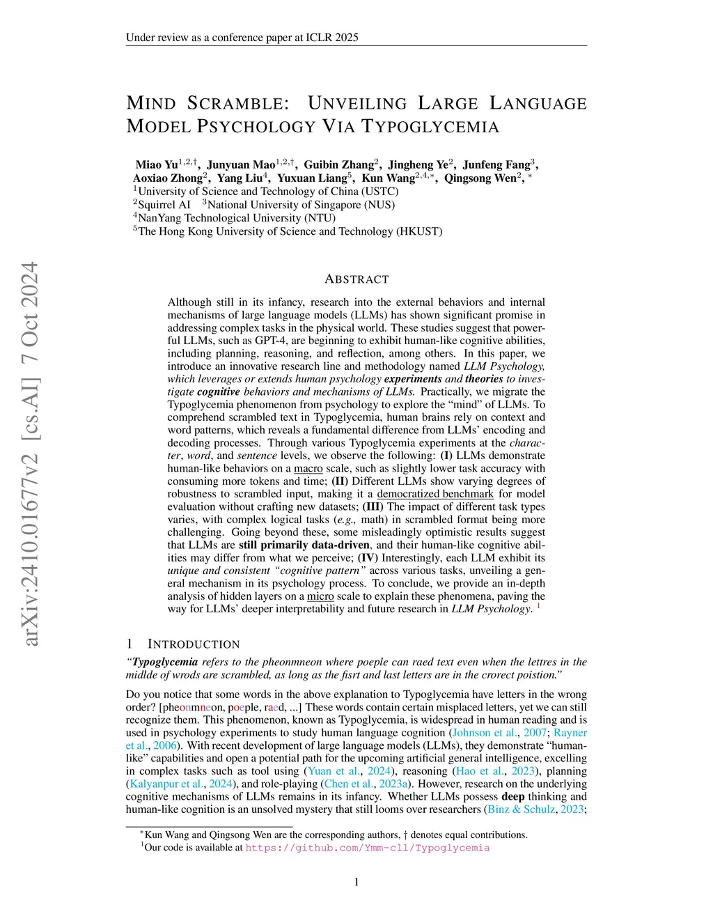 Research into the external behaviors and internal mechanisms of large language models (LLMs) has shown promise in addressing complex tasks in the physical world. Studies suggest that powerful LLMs, like GPT-4, are beginning to exhibit human-like cognitive abilities, including planning, reasoning, and reflection. In this paper, we introduce a research line and methodology called LLM Psychology, leveraging human psychology experiments to investigate the cognitive behaviors and mechanisms of LLMs. We migrate the Typoglycemia phenomenon from psychology to explore the "mind" of LLMs. Unlike human brains, which rely on context and word patterns to comprehend scrambled text, LLMs use distinct encoding and decoding processes. Through Typoglycemia experiments at the character, word, and sentence levels, we observe: (I) LLMs demonstrate human-like behaviors on a macro scale, such as lower task accuracy and higher token/time consumption; (II) LLMs exhibit varying robustness to scrambled input, making Typoglycemia a benchmark for model evaluation without new datasets; (III) Different task types have varying impacts, with complex logical tasks (e.g., math) being more challenging in scrambled form; (IV) Each LLM has a unique and consistent "cognitive pattern" across tasks, revealing general mechanisms in its psychology process. We provide an in-depth analysis of hidden layers to explain these phenomena, paving the way for future research in LLM Psychology and deeper interpretability.