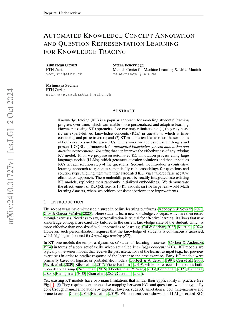 Automated Knowledge Concept Annotation and Question Representation Learning for Knowledge Tracing