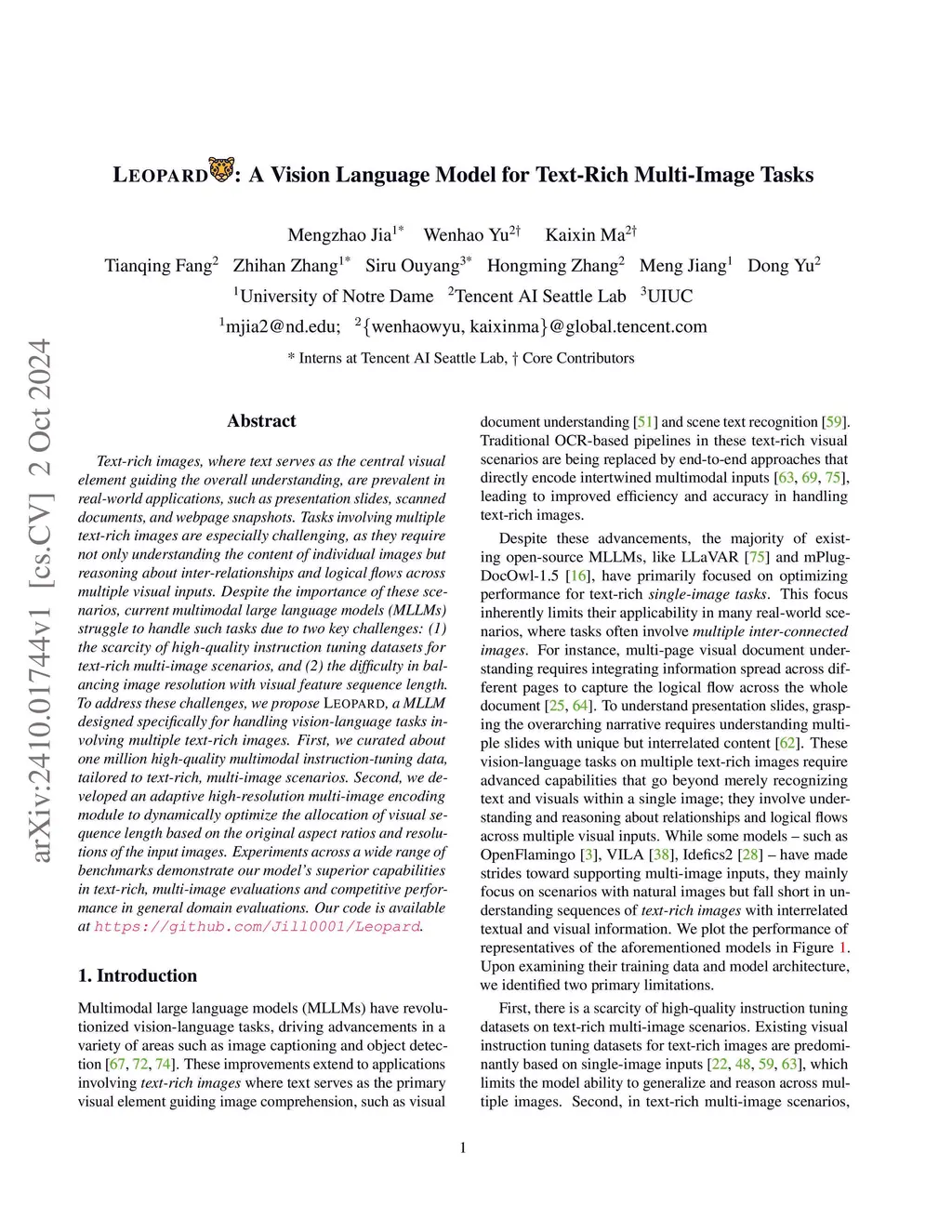 Text-rich images, where text serves as the central visual element guiding the overall understanding, are prevalent in real-world applications, such as presentation slides, scanned documents, and webpage snapshots. Tasks involving multiple text-rich images are especially challenging, as they require not only understanding the content of individual images but reasoning about inter-relationships and logical flows across multiple visual inputs. Despite the importance of these scenarios, current multimodal large language models (MLLMs) struggle to handle such tasks due to two key challenges: (1) the scarcity of high-quality instruction tuning datasets for text-rich multi-image scenarios, and (2) the difficulty in balancing image resolution with visual feature sequence length. To address these challenges, we propose Leopard, an MLLM tailored for handling vision-language tasks involving multiple text-rich images. First, we curated about one million high-quality multimodal instruction-tuning data, tailored to text-rich, multi-image scenarios. Second, we proposed an adaptive high-resolution multi-image encoding module to dynamically optimize the allocation of visual sequence length based on the original aspect ratios and resolutions of images. Experiments on a diverse set of benchmarks reveal that our model consistently outperforms state-of-the-art systems, such as Llama-3.2 and Qwen2-VL, in challenging text-rich, multi-image evaluations. Remarkably, our approach achieves outstanding performance using only 1.2M training instances, all of which are fully open-sourced, demonstrating both high efficiency and effectiveness compared to models trained on large-scale in-house data. Our code and data are available atthis https URL.