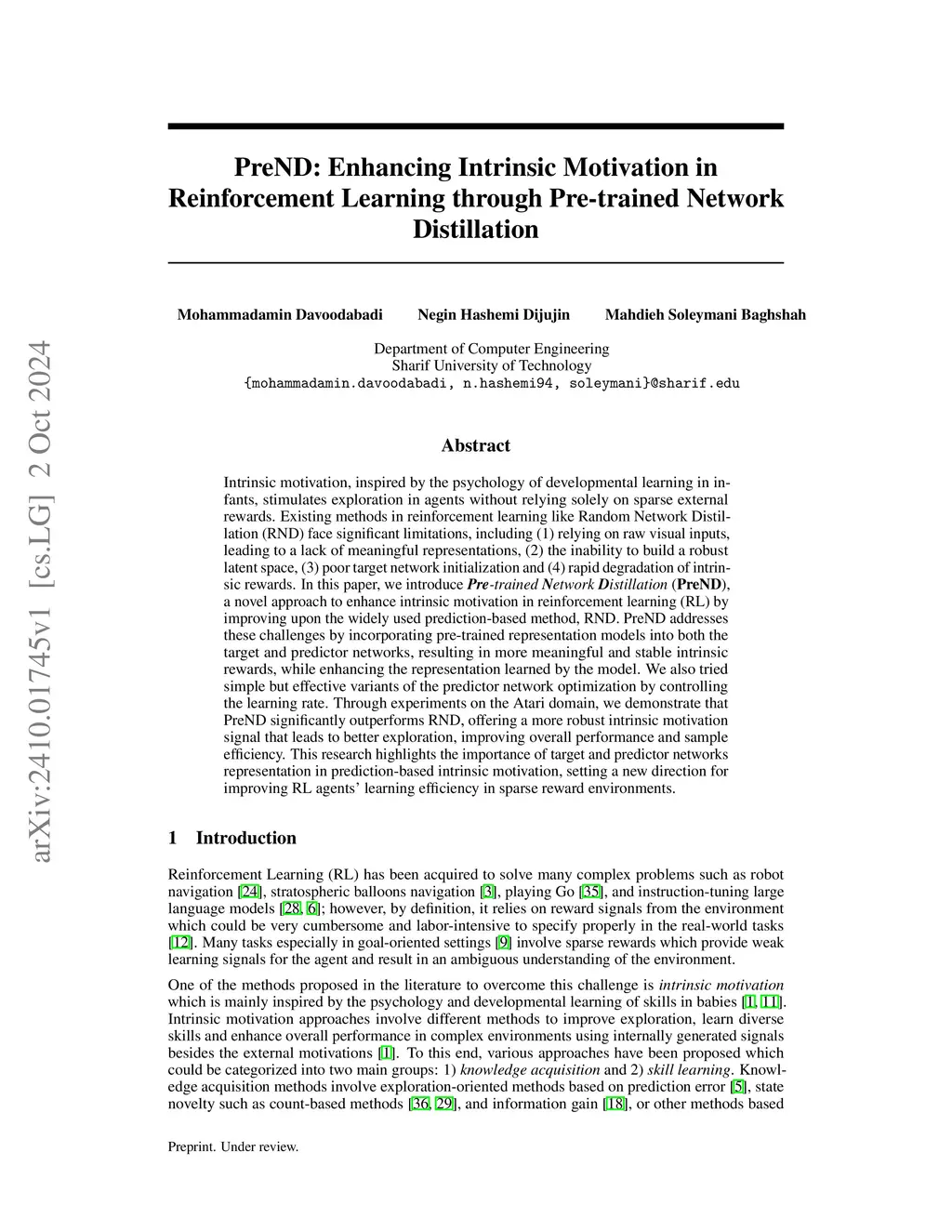 Intrinsic motivation, inspired by the psychology of developmental learning in infants, stimulates exploration in agents without relying solely on sparse external rewards. Existing methods in reinforcement learning like Random Network Distillation (RND) face significant limitations, including (1) relying on raw visual inputs, leading to a lack of meaningful representations, (2) the inability to build a robust latent space, (3) poor target network initialization and (4) rapid degradation of intrinsic rewards. In this paper, we introduce Pre-trained Network Distillation (PreND), a novel approach to enhance intrinsic motivation in reinforcement learning (RL) by improving upon the widely used prediction-based method, RND. PreND addresses these challenges by incorporating pre-trained representation models into both the target and predictor networks, resulting in more meaningful and stable intrinsic rewards, while enhancing the representation learned by the model. We also tried simple but effective variants of the predictor network optimization by controlling the learning rate. Through experiments on the Atari domain, we demonstrate that PreND significantly outperforms RND, offering a more robust intrinsic motivation signal that leads to better exploration, improving overall performance and sample efficiency. This research highlights the importance of target and predictor networks representation in prediction-based intrinsic motivation, setting a new direction for improving RL agents' learning efficiency in sparse reward environments.