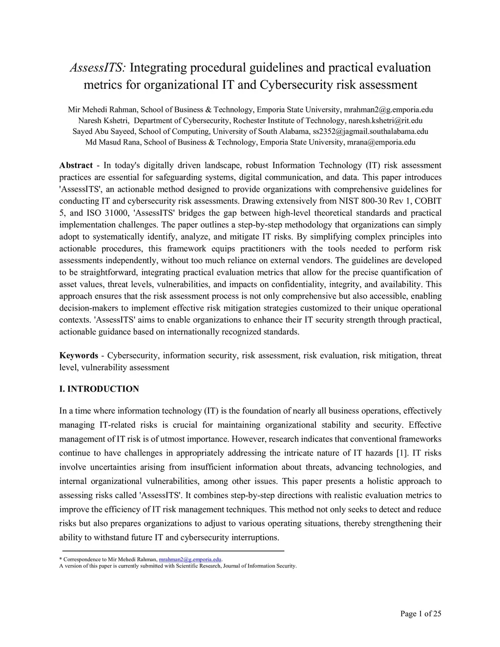 In today's digitally driven landscape, robust Information Technology (IT) risk assessment practices are essential for safeguarding systems, digital communication, and data. This paper introduces ÁssessITS', an actionable method designed to provide organizations with comprehensive guidelines for conducting IT and cybersecurity risk assessments. Drawing extensively from NIST 800-30 Rev 1, COBIT 5, and ISO 31000, ÁssessITS' bridges the gap between high-level theoretical standards and practical implementation challenges. The paper outlines a step-by-step methodology that organizations can simply adopt to systematically identify, analyze, and mitigate IT risks. By simplifying complex principles into actionable procedures, this framework equips practitioners with the tools needed to perform risk assessments independently, without too much reliance on external vendors. The guidelines are developed to be straightforward, integrating practical evaluation metrics that allow for the precise quantification of asset values, threat levels, vulnerabilities, and impacts on confidentiality, integrity, and availability. This approach ensures that the risk assessment process is not only comprehensive but also accessible, enabling decision-makers to implement effective risk mitigation strategies customized to their unique operational contexts. ÁssessITS' aims to enable organizations to enhance their IT security strength through practical, actionable guidance based on internationally recognized standards.