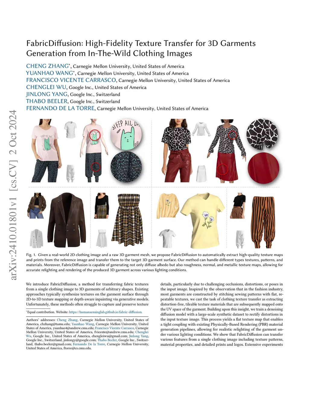 We introduce FabricDiffusion, a method for transferring fabric textures from a single clothing image to 3D garments of arbitrary shapes. Existing approaches typically synthesize textures on the garment surface through 2D-to-3D texture mapping or depth-aware inpainting via generative models. Unfortunately, these methods often struggle to capture and preserve texture details, particularly due to challenging occlusions, distortions, or poses in the input image. Inspired by the observation that in the fashion industry, most garments are constructed by stitching sewing patterns with flat, repeatable textures, we cast the task of clothing texture transfer as extracting distortion-free, tileable texture materials that are subsequently mapped onto the UV space of the garment. Building upon this insight, we train a denoising diffusion model with a large-scale synthetic dataset to rectify distortions in the input texture image. This process yields a flat texture map that enables a tight coupling with existing Physically-Based Rendering (PBR) material generation pipelines, allowing for realistic relighting of the garment under various lighting conditions. We show that FabricDiffusion can transfer various features from a single clothing image including texture patterns, material properties, and detailed prints and logos. Extensive experiments demonstrate that our model significantly outperforms state-to-the-art methods on both synthetic data and real-world, in-the-wild clothing images while generalizing to unseen textures and garment shapes.
