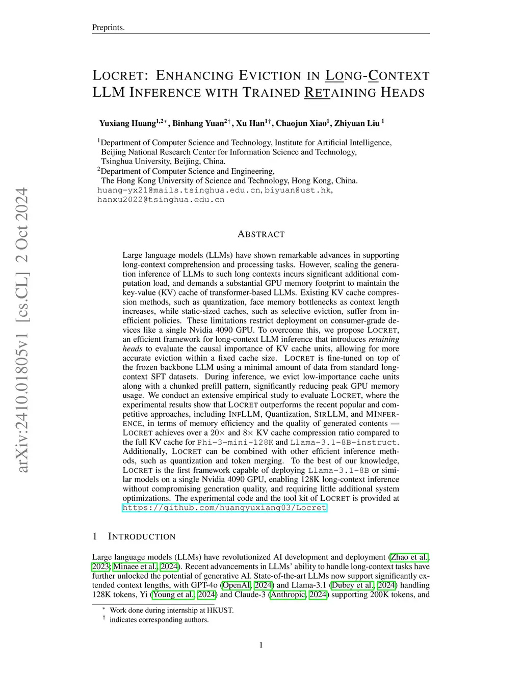 Scaling the input context length of a large language model (LLM) incurs a significant increase in computation cost and memory footprint to maintain the attention key-value (KV) cache. Existing KV cache compression methods suffer from inefficient compression strategies and limited memory reduction effects, making it difficult for LLMs to conduct long-context inference on consumer-grade devices, especially when inferring long-context stream input. Such obstacles prevent consumer-grade devices from supporting more complex applications, creating challenges for the democratization of LLMs. To overcome this, we propose Locret, the first framework to create an eviction policy compatible with chunked prefill. By evaluating the causal importance of KV cache units by learnable retaining heads, Locret enables precise eviction of cache units, facilitating efficient long-context inference. In our extensive empirical studies, Locret outperforms the recent popular and competitive approaches in terms of memory efficiency and generation quality -- Locret achieves up to 20x of KV cache compression ratio within less than 10% performance loss. Furthermore, Locret achieves 128K+ long-context inference on a single NVIDIA 4090 GPU without compromising generation quality and only costs <1 GPU hour of additional training.