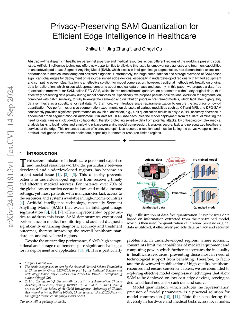 The disparity in healthcare personnel expertise and medical resources across different regions of the world is a pressing social issue. Artificial intelligence technology offers new opportunities to alleviate this issue. Segment Anything Model (SAM), which excels in intelligent image segmentation, has demonstrated exceptional performance in medical monitoring and assisted diagnosis. Unfortunately, the huge computational and storage overhead of SAM poses significant challenges for deployment on resource-limited edge devices. Quantization is an effective solution for model compression; however, traditional methods rely heavily on original data for calibration, which raises widespread concerns about medical data privacy and security. In this paper, we propose a data-free quantization framework for SAM, called DFQ-SAM, which learns and calibrates quantization parameters without any original data, thus effectively preserving data privacy during model compression. Specifically, we propose pseudo-positive label evolution for segmentation, combined with patch similarity, to fully leverage the semantic and distribution priors in pre-trained models, which facilitates high-quality data synthesis as a substitute for real data. Furthermore, we introduce scale reparameterization to ensure the accuracy of low-bit quantization. We perform extensive segmentation experiments on various datasets, and DFQ-SAM consistently provides significant performance on low-bit quantization. DFQ-SAM eliminates the need for data transfer in cloud-edge collaboration, thereby protecting sensitive data from potential attacks. It enables secure, fast, and personalized healthcare services at the edge, which enhances system efficiency and optimizes resource allocation, and thus facilitating the pervasive application of artificial intelligence in worldwide healthcare.