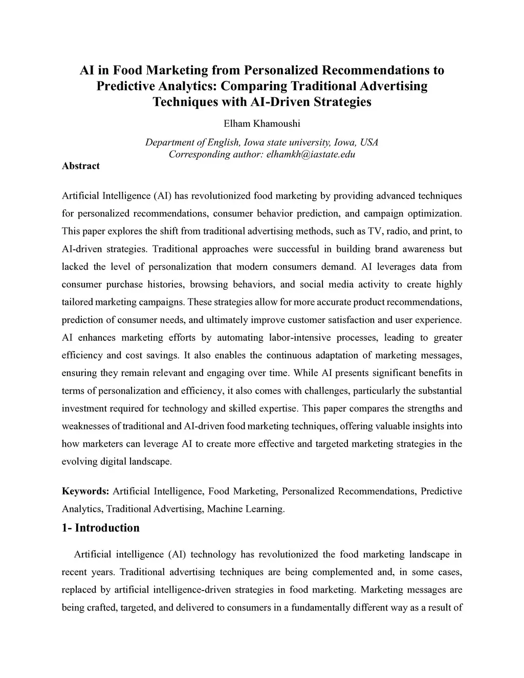 Artificial Intelligence (AI) has revolutionized food marketing by providing advanced techniques for personalized recommendations, consumer behavior prediction, and campaign optimization. This paper explores the shift from traditional advertising methods, such as TV, radio, and print, to AI-driven strategies. Traditional approaches were successful in building brand awareness but lacked the level of personalization that modern consumers demand. AI leverages data from consumer purchase histories, browsing behaviors, and social media activity to create highly tailored marketing campaigns. These strategies allow for more accurate product recommendations, prediction of consumer needs, and ultimately improve customer satisfaction and user experience. AI enhances marketing efforts by automating labor-intensive processes, leading to greater efficiency and cost savings. It also enables the continuous adaptation of marketing messages, ensuring they remain relevant and engaging over time. While AI presents significant benefits in terms of personalization and efficiency, it also comes with challenges, particularly the substantial investment required for technology and skilled expertise. This paper compares the strengths and weaknesses of traditional and AI-driven food marketing techniques, offering valuable insights into how marketers can leverage AI to create more effective and targeted marketing strategies in the evolving digital landscape.