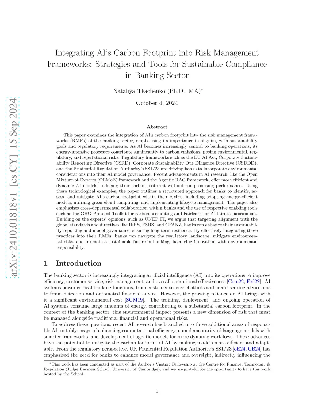 This paper examines the integration of AI's carbon footprint into the risk management frameworks (RMFs) of the banking sector, emphasising its importance in aligning with sustainability goals and regulatory requirements. As AI becomes increasingly central to banking operations, its energy-intensive processes contribute significantly to carbon emissions, posing environmental, regulatory, and reputational risks. Regulatory frameworks such as the EU AI Act, Corporate Sustainability Reporting Directive (CSRD), Corporate Sustainability Due Diligence Directive (CSDDD), and the Prudential Regulation Authority's SS1/23 are driving banks to incorporate environmental considerations into their AI model governance. Recent advancements in AI research, like the Open Mixture-of-Experts (OLMoE) framework and the Agentic RAG framework, offer more efficient and dynamic AI models, reducing their carbon footprint without compromising performance. Using these technological examples, the paper outlines a structured approach for banks to identify, assess, and mitigate AI's carbon footprint within their RMFs, including adopting energy-efficient models, utilising green cloud computing, and implementing lifecycle management.