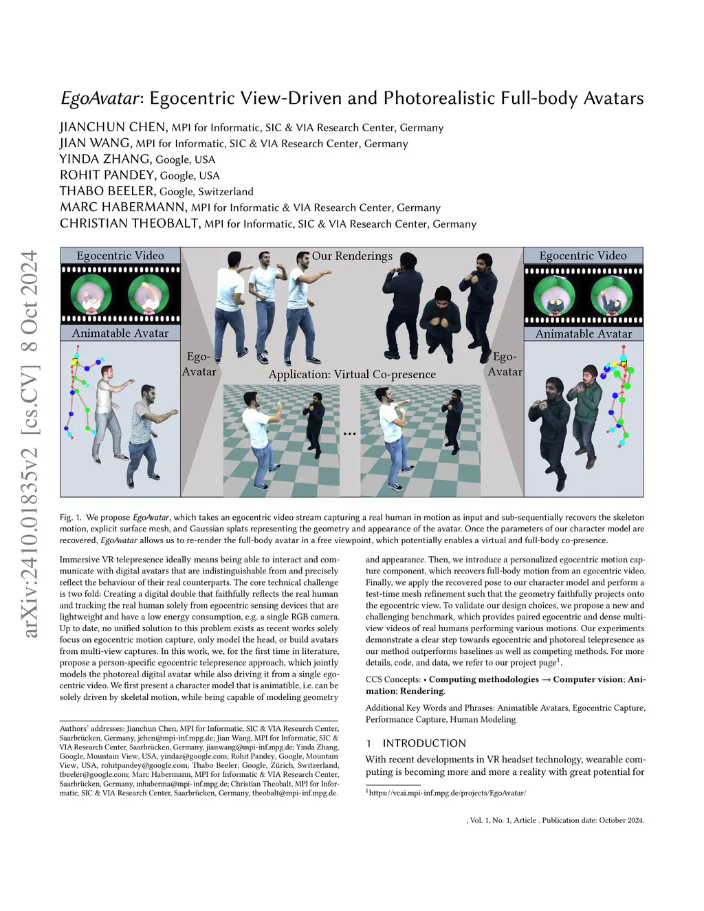 Immersive VR telepresence ideally means being able to interact and communicate with digital avatars that are indistinguishable from and precisely reflect the behaviour of their real counterparts. The core technical challenge is two fold: Creating a digital double that faithfully reflects the real human and tracking the real human solely from egocentric sensing devices that are lightweight and have a low energy consumption, e.g. a single RGB camera. Up to date, no unified solution to this problem exists as recent works solely focus on egocentric motion capture, only model the head, or build avatars from multi-view captures. In this work, we, for the first time in literature, propose a person-specific egocentric telepresence approach, which jointly models the photoreal digital avatar while also driving it from a single egocentric video. We first present a character model that is animatible, i.e. can be solely driven by skeletal motion, while being capable of modeling geometry and appearance. Then, we introduce a personalized egocentric motion capture component, which recovers full-body motion from an egocentric video. Finally, we apply the recovered pose to our character model and perform a test-time mesh refinement such that the geometry faithfully projects onto the egocentric view. To validate our design choices, we propose a new and challenging benchmark, which provides paired egocentric and dense multi-view videos of real humans performing various motions. Our experiments demonstrate a clear step towards egocentric and photoreal telepresence as our method outperforms baselines as well as competing methods. For more details, code, and data, we refer to our project page.