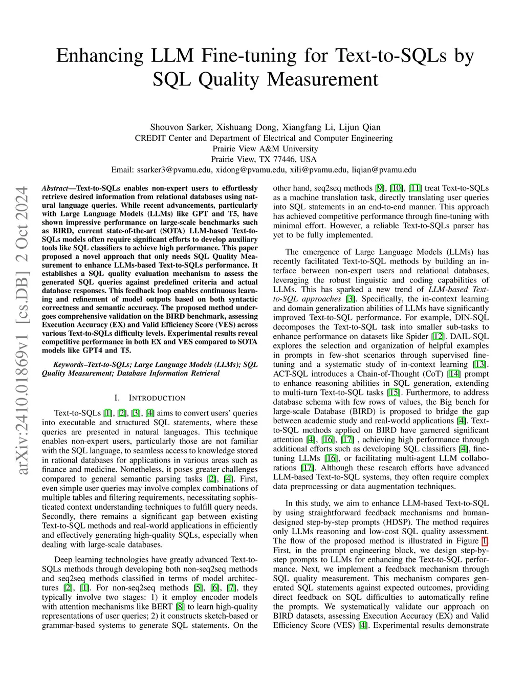 Text-to-SQLs enables non-expert users to effortlessly retrieve desired information from relational databases using natural language queries. While recent advancements, particularly with Large Language Models (LLMs) like GPT and T5, have shown impressive performance on large-scale benchmarks such as BIRD, current state-of-the-art (SOTA) LLM-based Text-to-SQLs models often require significant efforts to develop auxiliary tools like SQL classifiers to achieve high performance. This paper proposed a novel approach that only needs SQL Quality Measurement to enhance LLMs-based Text-to-SQLs performance. It establishes a SQL quality evaluation mechanism to assess the generated SQL queries against predefined criteria and actual database responses. This feedback loop enables continuous learning and refinement of model outputs based on both syntactic correctness and semantic accuracy. The proposed method undergoes comprehensive validation on the BIRD benchmark, assessing Execution Accuracy (EX) and Valid Efficiency Score (VES) across various Text-to-SQLs difficulty levels. Experimental results reveal competitive performance in both EX and VES compared to SOTA models like GPT4 and T5.