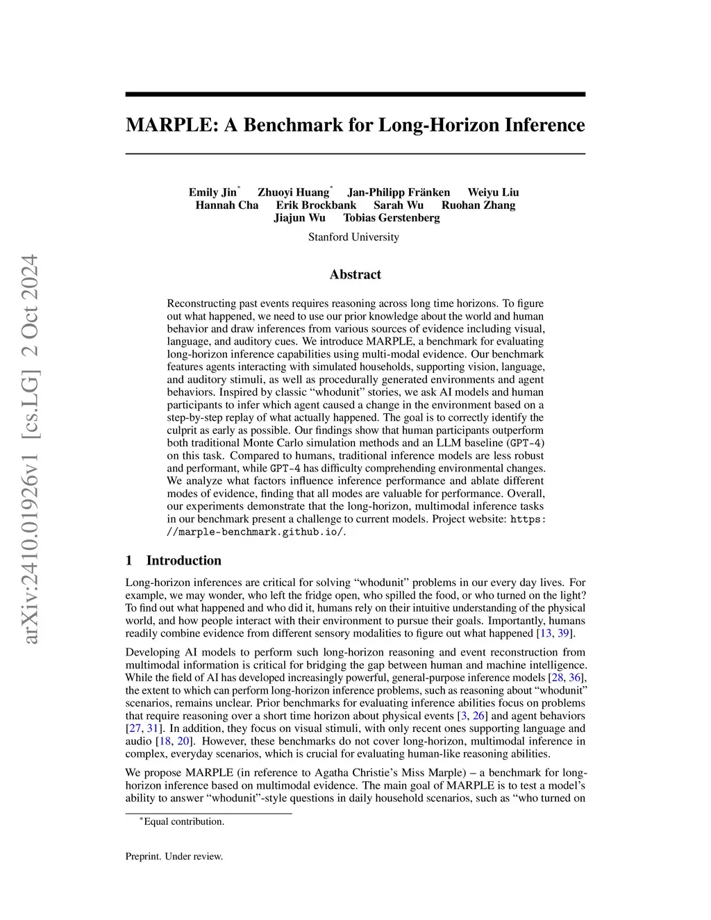 Reconstructing past events requires reasoning across long time horizons. To figure out what happened, we need to use our prior knowledge about the world and human behavior and draw inferences from various sources of evidence including visual, language, and auditory cues. We introduce MARPLE, a benchmark for evaluating long-horizon inference capabilities using multi-modal evidence. Our benchmark features agents interacting with simulated households, supporting vision, language, and auditory stimuli, as well as procedurally generated environments and agent behaviors. Inspired by classic ``whodunit'' stories, we ask AI models and human participants to infer which agent caused a change in the environment based on a step-by-step replay of what actually happened. The goal is to correctly identify the culprit as early as possible. Our findings show that human participants outperform both traditional Monte Carlo simulation methods and an LLM baseline (GPT-4) on this task. Compared to humans, traditional inference models are less robust and performant, while GPT-4 has difficulty comprehending environmental changes. We analyze what factors influence inference performance and ablate different modes of evidence, finding that all modes are valuable for performance. Overall, our experiments demonstrate that the long-horizon, multimodal inference tasks in our benchmark present a challenge to current models.