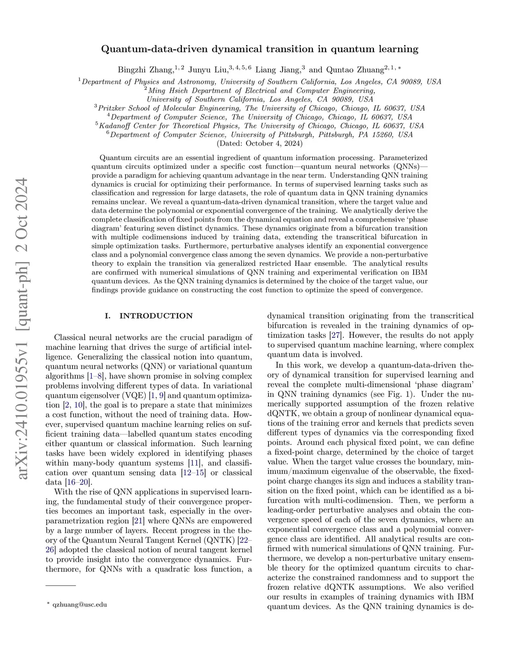 Quantum neural networks, parameterized quantum circuits optimized under a specific cost function, provide a paradigm for achieving near-term quantum advantage in quantum information processing. Understanding QNN training dynamics is crucial for optimizing their performance, however, the role of quantum data in training for supervised learning such as classification and regression remains unclear. We reveal a quantum-data-driven dynamical transition where the target values and data determine the convergence of the training. Through analytical classification over the fixed points of the dynamical equation, we reveal a comprehensive `phase diagram' featuring seven distinct dynamics originating from a bifurcation with multiple codimension. Perturbative analyses identify both exponential and polynomial convergence class. We provide a non-perturbative theory to explain the transition via generalized restricted Haar ensemble. The analytical results are confirmed with numerical simulations and experimentation on IBM quantum devices. Our findings provide guidance on constructing the cost function to accelerate convergence in QNN training.