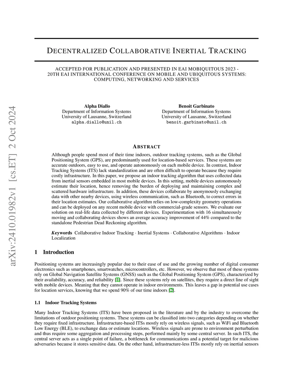 Although people spend most of their time indoors, outdoor tracking systems, such as the Global Positioning System (GPS), are predominantly used for location-based services. These systems are accurate outdoors, easy to use, and operate autonomously on each mobile device. In contrast, Indoor Tracking Systems~(ITS) lack standardization and are often difficult to operate because they require costly infrastructure. In this paper, we propose an indoor tracking algorithm that uses collected data from inertial sensors embedded in most mobile devices. In this setting, mobile devices autonomously estimate their location, hence removing the burden of deploying and maintaining complex and scattered hardware infrastructure. In addition, these devices collaborate by anonymously exchanging data with other nearby devices, using wireless communication, such as Bluetooth, to correct errors in their location estimates. Our collaborative algorithm relies on low-complexity geometry operations and can be deployed on any recent mobile device with commercial-grade sensors. We evaluate our solution on real-life data collected by different devices. Experimentation with 16 simultaneously moving and collaborating devices shows an average accuracy improvement of 44% compared to the standalone Pedestrian Dead Reckoning algorithm.