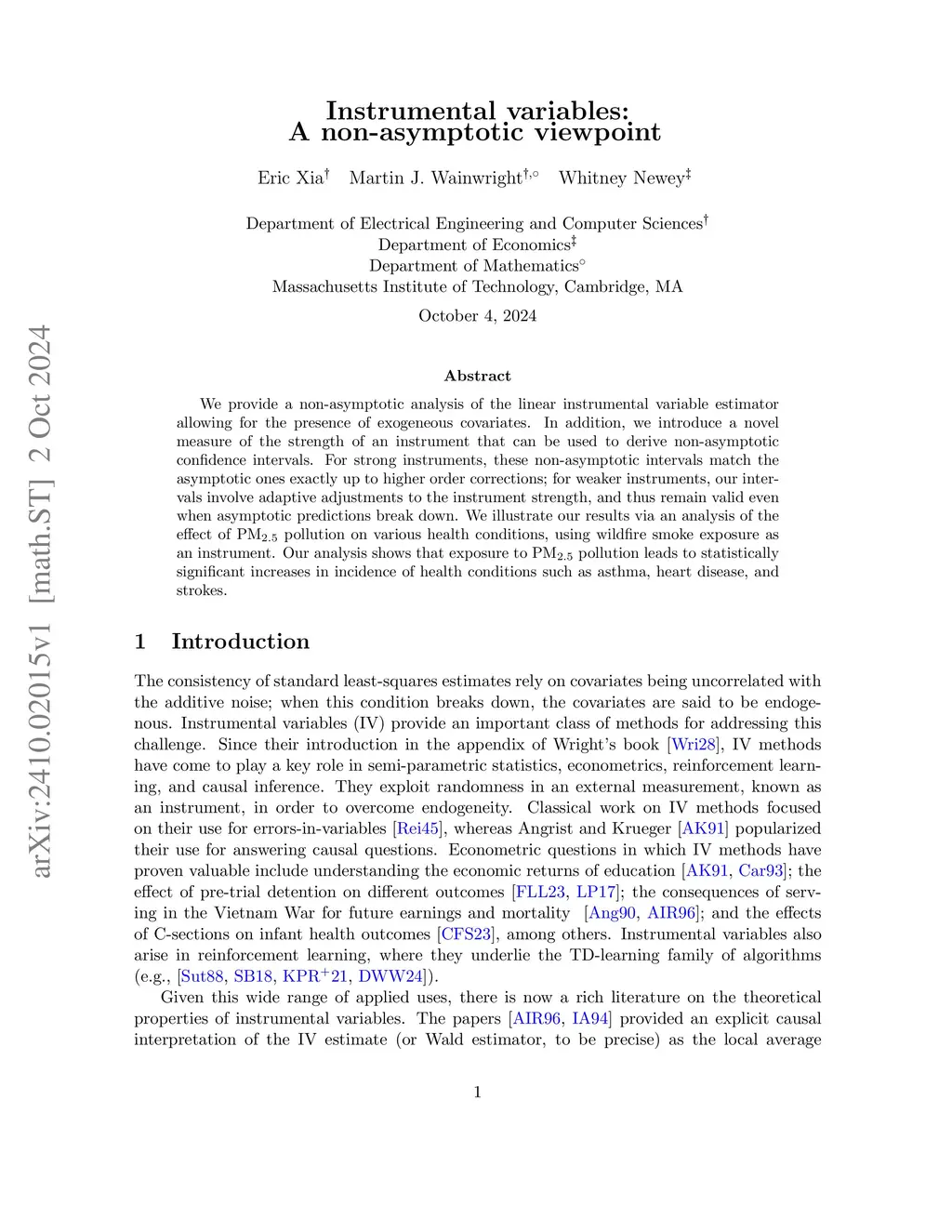 We provide a non-asymptotic analysis of the linear instrumental variable estimator allowing for the presence of exogeneous covariates. In addition, we introduce a novel measure of the strength of an instrument that can be used to derive non-asymptotic confidence intervals. For strong instruments, these non-asymptotic intervals match the asymptotic ones exactly up to higher order corrections; for weaker instruments, our intervals involve adaptive adjustments to the instrument strength, and thus remain valid even when asymptotic predictions break down. We illustrate our results via an analysis of the effect of PM2.5 pollution on various health conditions, using wildfire smoke exposure as an instrument. Our analysis shows that exposure to PM2.5 pollution leads to statistically significant increases in incidence of health conditions such as asthma, heart disease, and strokes.