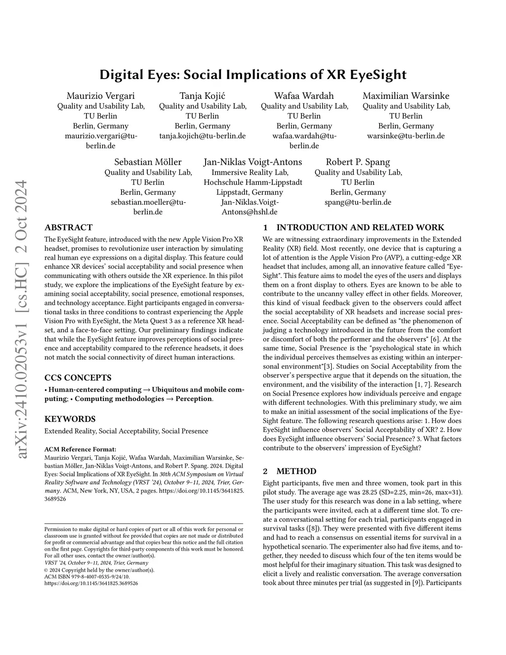 The EyeSight feature, introduced with the new Apple Vision Pro XR headset, promises to revolutionize user interaction by simulating real human eye expressions on a digital display. This feature could enhance XR devices' social acceptability and social presence when communicating with others outside the XR experience. In this pilot study, we explore the implications of the EyeSight feature by examining social acceptability, social presence, emotional responses, and technology acceptance. Eight participants engaged in conversational tasks in three conditions to contrast experiencing the Apple Vision Pro with EyeSight, the Meta Quest 3 as a reference XR headset, and a face-to-face setting. Our preliminary findings indicate that while the EyeSight feature improves perceptions of social presence and acceptability compared to the reference headsets, it does not match the social connectivity of direct human interactions.
