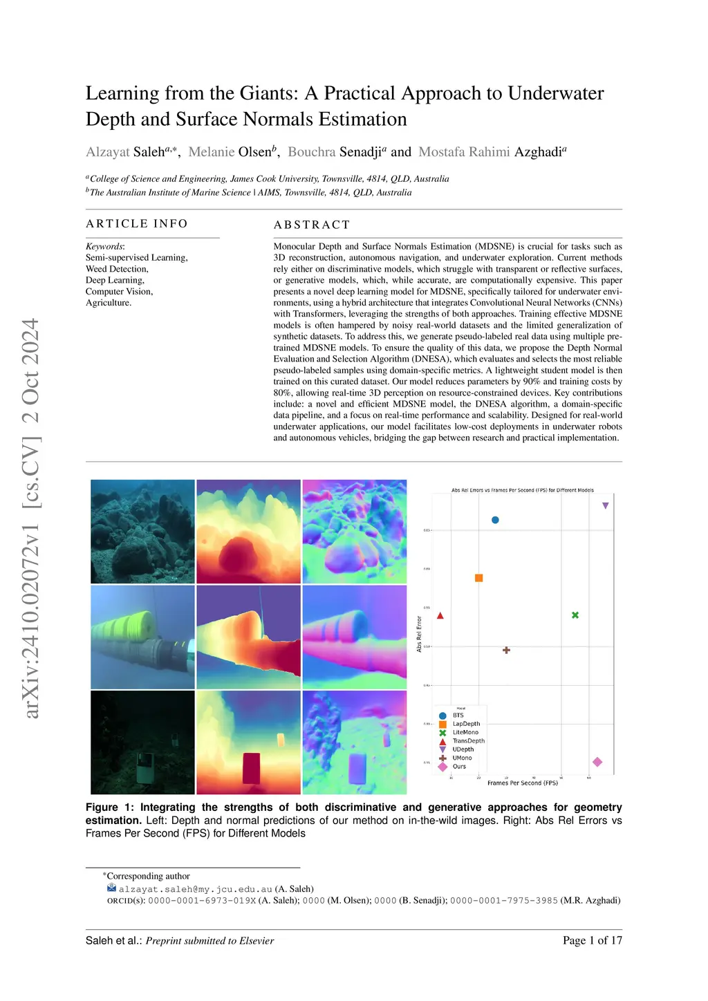 Monocular Depth and Surface Normals Estimation (MDSNE) is crucial for tasks such as 3D reconstruction, autonomous navigation, and underwater exploration. Current methods rely either on discriminative models, which struggle with transparent or reflective surfaces, or generative models, which, while accurate, are computationally expensive. This paper presents a novel deep learning model for MDSNE, specifically tailored for underwater environments, using a hybrid architecture that integrates Convolutional Neural Networks (CNNs) with Transformers, leveraging the strengths of both approaches. Training effective MDSNE models is often hampered by noisy real-world datasets and the limited generalization of synthetic datasets. To address this, we generate pseudo-labeled real data using multiple pre-trained MDSNE models. To ensure the quality of this data, we propose the Depth Normal Evaluation and Selection Algorithm (DNESA), which evaluates and selects the most reliable pseudo-labeled samples using domain-specific metrics. A lightweight student model is then trained on this curated dataset. Our model reduces parameters by 90% and training costs by 80%, allowing real-time 3D perception on resource-constrained devices. Key contributions include: a novel and efficient MDSNE model, the DNESA algorithm, a domain-specific data pipeline, and a focus on real-time performance and scalability. Designed for real-world underwater applications, our model facilitates low-cost deployments in underwater robots and autonomous vehicles, bridging the gap between research and practical implementation.