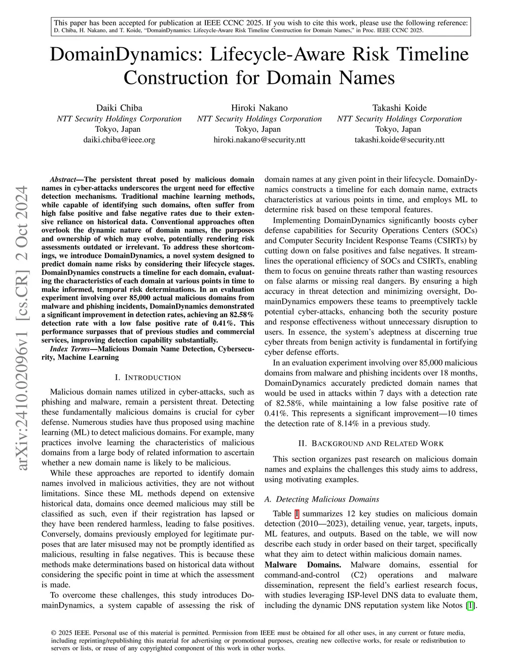 The persistent threat posed by malicious domain names in cyber-attacks underscores the urgent need for effective detection mechanisms. Traditional machine learning methods, while capable of identifying such domains, often suffer from high false positive and false negative rates due to their extensive reliance on historical data. Conventional approaches often overlook the dynamic nature of domain names, the purposes and ownership of which may evolve, potentially rendering risk assessments outdated or irrelevant. To address these shortcomings, we introduce DomainDynamics, a novel system designed to predict domain name risks by considering their lifecycle stages. DomainDynamics constructs a timeline for each domain, evaluating the characteristics of each domain at various points in time to make informed, temporal risk determinations. In an evaluation experiment involving over 85,000 actual malicious domains from malware and phishing incidents, DomainDynamics demonstrated a significant improvement in detection rates, achieving an 82.58\% detection rate with a low false positive rate of 0.41\%. This performance surpasses that of previous studies and commercial services, improving detection capability substantially.