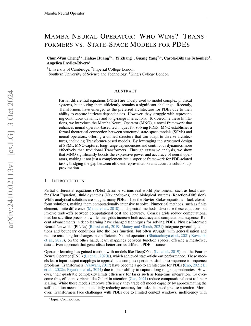 Partial differential equations (PDEs) are widely used to model complex physical systems, but solving them efficiently remains a significant challenge. Recently, Transformers have emerged as the preferred architecture for PDEs due to their ability to capture intricate dependencies. However, they struggle with representing continuous dynamics and long-range interactions. To overcome these limitations, we introduce the Mamba Neural Operator (MNO), a novel framework that enhances neural operator-based techniques for solving PDEs. MNO establishes a formal theoretical connection between structured state-space models (SSMs) and neural operators, offering a unified structure that can adapt to diverse architectures, including Transformer-based models. By leveraging the structured design of SSMs, MNO captures long-range dependencies and continuous dynamics more effectively than traditional Transformers. Through extensive analysis, we show that MNO significantly boosts the expressive power and accuracy of neural operators, making it not just a complement but a superior framework for PDE-related tasks, bridging the gap between efficient representation and accurate solution approximation.