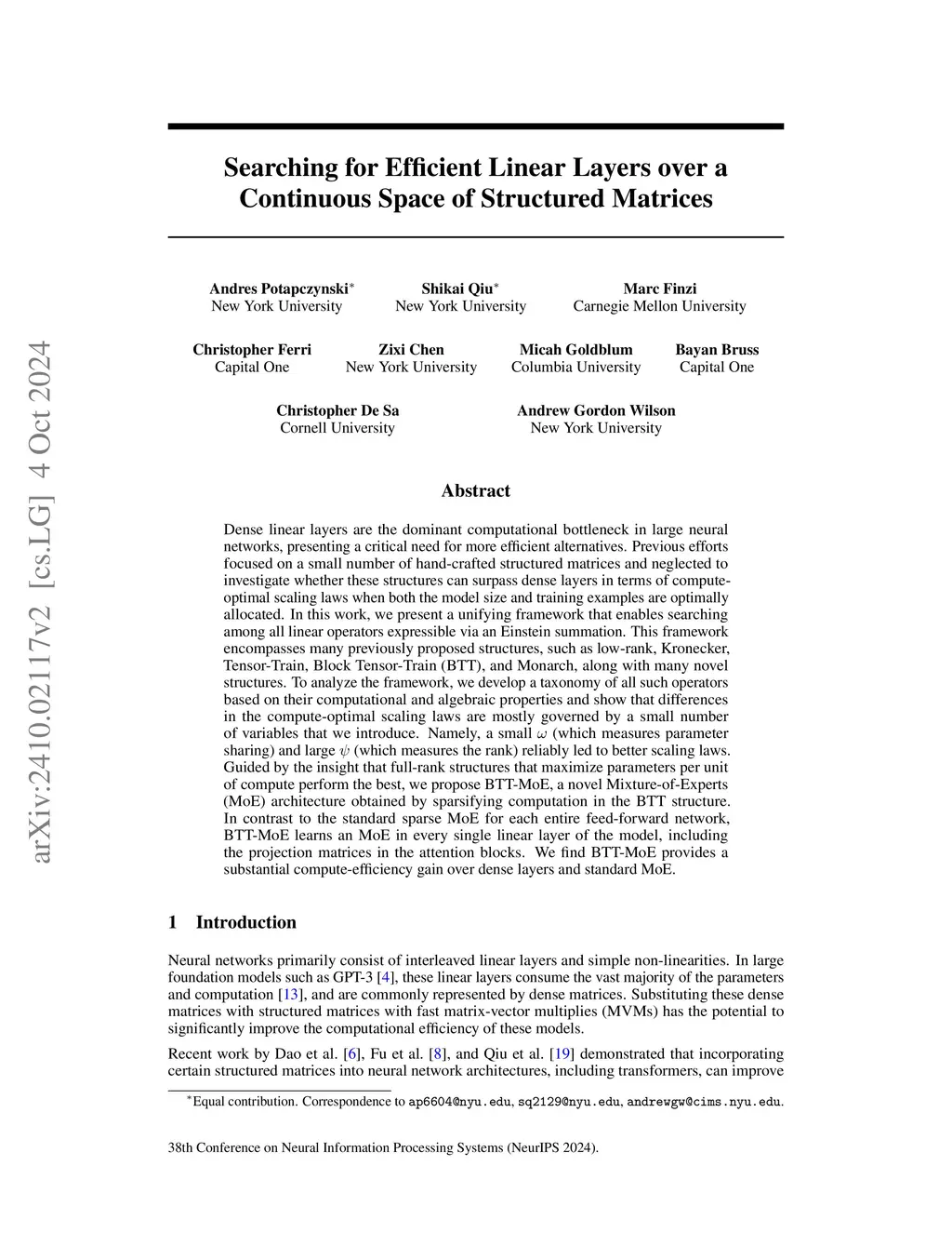 Dense linear layers are the dominant computational bottleneck in large neural networks, presenting a critical need for more efficient alternatives. Previous efforts focused on a small number of hand-crafted structured matrices and neglected to investigate whether these structures can surpass dense layers in terms of compute-optimal scaling laws when both the model size and training examples are optimally allocated. In this work, we present a unifying framework that enables searching among all linear operators expressible via an Einstein summation. This framework encompasses many previously proposed structures, such as low-rank, Kronecker, Tensor-Train, Block Tensor-Train (BTT), and Monarch, along with many novel structures. To analyze the framework, we develop a taxonomy of all such operators based on their computational and algebraic properties and show that differences in the compute-optimal scaling laws are mostly governed by a small number of variables that we introduce. Namely, a small (which measures parameter sharing) and large (which measures the rank) reliably led to better scaling laws. Guided by the insight that full-rank structures that maximize parameters per unit of compute perform the best, we propose BTT-MoE, a novel Mixture-of-Experts (MoE) architecture obtained by sparsifying computation in the BTT structure. In contrast to the standard sparse MoE for each entire feed-forward network, BTT-MoE learns an MoE in every single linear layer of the model, including the projection matrices in the attention blocks. We find BTT-MoE provides a substantial compute-efficiency gain over dense layers and standard MoE.