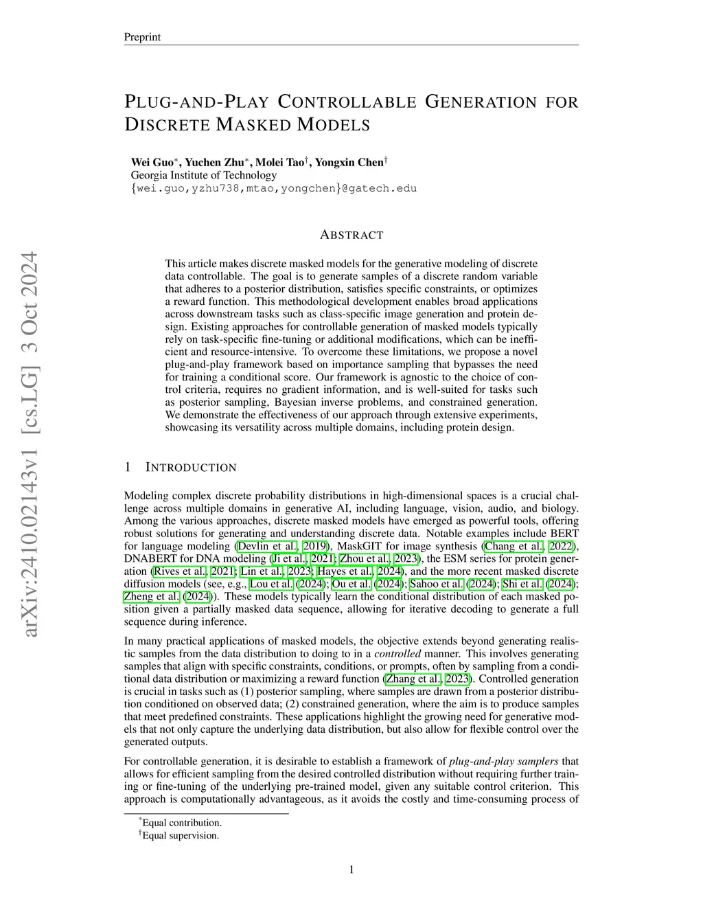 This article makes discrete masked models for the generative modeling of discrete data controllable. The goal is to generate samples of a discrete random variable that adheres to a posterior distribution, satisfies specific constraints, or optimizes a reward function. This methodological development enables broad applications across downstream tasks such as class-specific image generation and protein design. Existing approaches for controllable generation of masked models typically rely on task-specific fine-tuning or additional modifications, which can be inefficient and resource-intensive. To overcome these limitations, we propose a novel plug-and-play framework based on importance sampling that bypasses the need for training a conditional score. Our framework is agnostic to the choice of control criteria, requires no gradient information, and is well-suited for tasks such as posterior sampling, Bayesian inverse problems, and constrained generation. We demonstrate the effectiveness of our approach through extensive experiments, showcasing its versatility across multiple domains, including protein design.