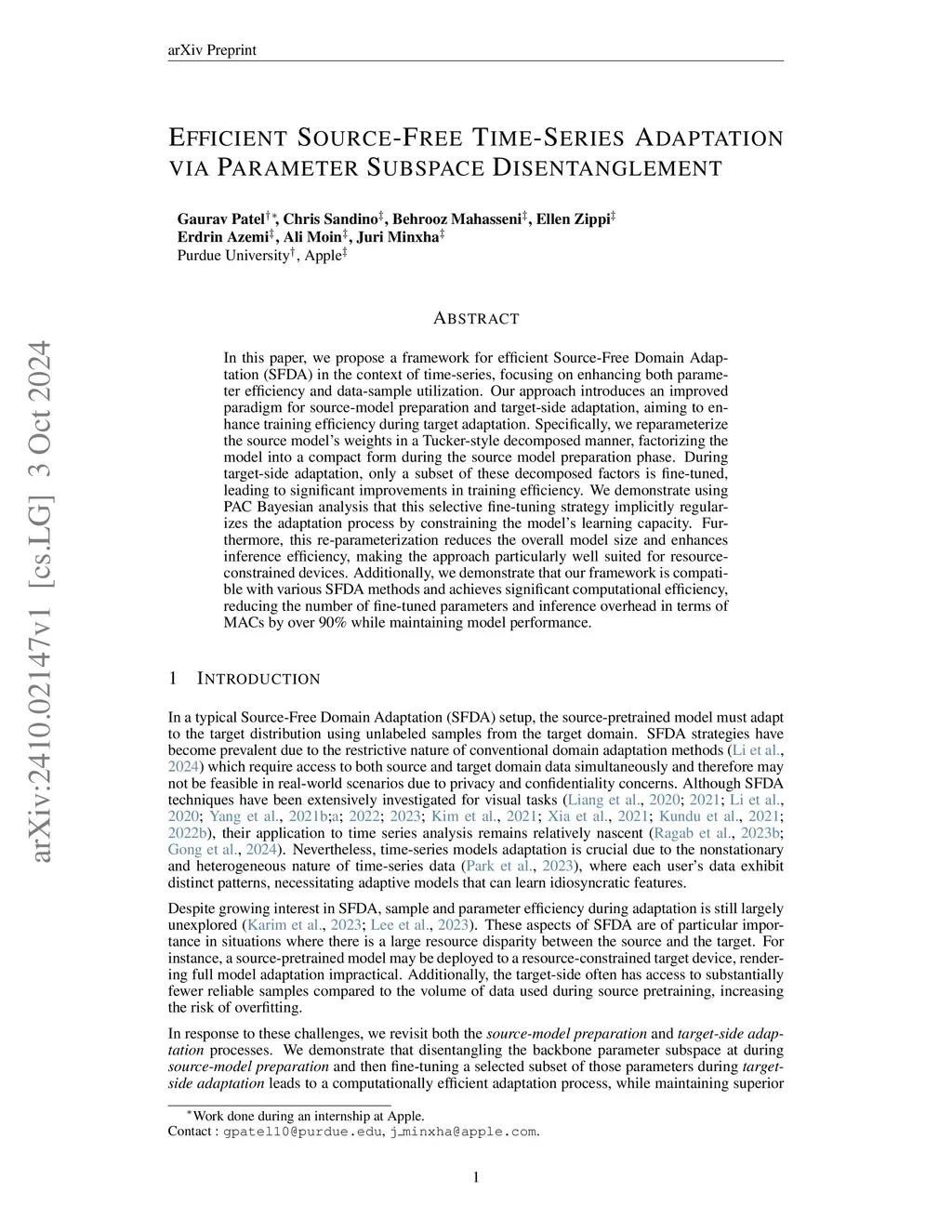 In this paper, we propose a framework for efficient Source-Free Domain Adaptation (SFDA) in the context of time-series, focusing on enhancing both parameter efficiency and data-sample utilization. Our approach introduces an improved paradigm for source-model preparation and target-side adaptation, aiming to enhance training efficiency during target adaptation. Specifically, we reparameterize the source model's weights in a Tucker-style decomposed manner, factorizing the model into a compact form during the source model preparation phase. During target-side adaptation, only a subset of these decomposed factors is fine-tuned, leading to significant improvements in training efficiency. We demonstrate using PAC Bayesian analysis that this selective fine-tuning strategy implicitly regularizes the adaptation process by constraining the model's learning capacity. Furthermore, this re-parameterization reduces the overall model size and enhances inference efficiency, making the approach particularly well suited for resource-constrained devices. Additionally, we demonstrate that our framework is compatible with various SFDA methods and achieves significant computational efficiency, reducing the number of fine-tuned parameters and inference overhead in terms of MACs by over 90% while maintaining model performance.