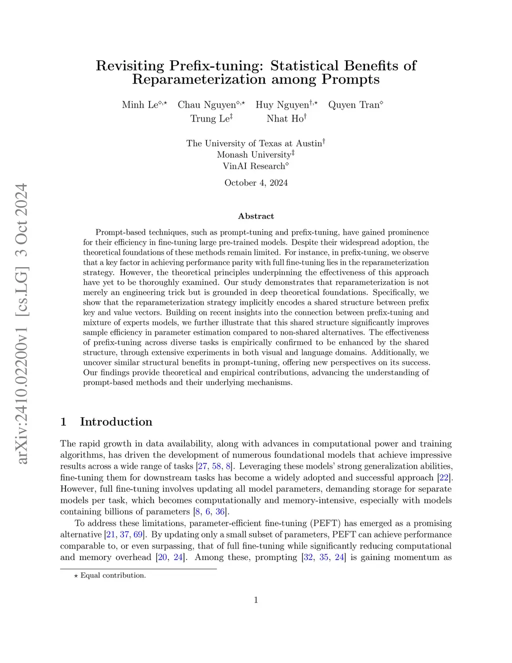 Prompt-based techniques, such as prompt-tuning and prefix-tuning, have gained prominence for their efficiency in fine-tuning large pre-trained models. Despite their widespread adoption, the theoretical foundations of these methods remain limited. For instance, in prefix-tuning, we observe that a key factor in achieving performance parity with full fine-tuning lies in the reparameterization strategy. However, the theoretical principles underpinning the effectiveness of this approach have yet to be thoroughly examined. Our study demonstrates that reparameterization is not merely an engineering trick but is grounded in deep theoretical foundations. Specifically, we show that the reparameterization strategy implicitly encodes a shared structure between prefix key and value vectors. Building on recent insights into the connection between prefix-tuning and mixture of experts models, we further illustrate that this shared structure significantly improves sample efficiency in parameter estimation compared to non-shared alternatives. The effectiveness of prefix-tuning across diverse tasks is empirically confirmed to be enhanced by the shared structure, through extensive experiments in both visual and language domains. Additionally, we uncover similar structural benefits in prompt-tuning, offering new perspectives on its success. Our findings provide theoretical and empirical contributions, advancing the understanding of prompt-based methods and their underlying mechanisms.
