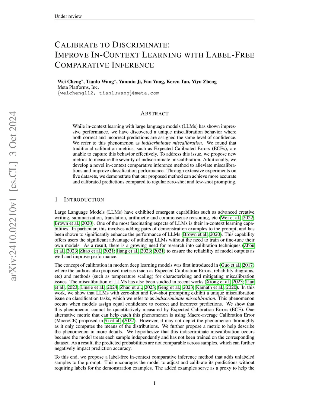 While in-context learning with large language models (LLMs) has shown impressive performance, we have discovered a unique miscalibration behavior where both correct and incorrect predictions are assigned the same level of confidence. We refer to this phenomenon as indiscriminate miscalibration. We found that traditional calibration metrics, such as Expected Calibrated Errors (ECEs), are unable to capture this behavior effectively. To address this issue, we propose new metrics to measure the severity of indiscriminate miscalibration. Additionally, we develop a novel in-context comparative inference method to alleviate miscalibrations and improve classification performance. Through extensive experiments on five datasets, we demonstrate that our proposed method can achieve more accurate and calibrated predictions compared to regular zero-shot and few-shot prompting.