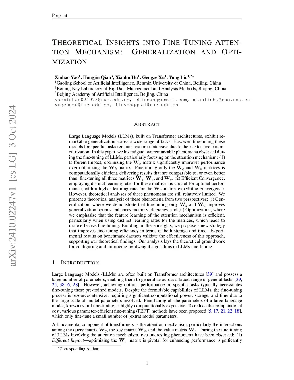Large Language Models (LLMs), built on Transformer architectures, exhibit remarkable generalization across a wide range of tasks. However, fine-tuning these models for specific tasks remains resource-intensive due to their extensive parameterization. In this paper, we explore two remarkable phenomena related to the attention mechanism during the fine-tuning of LLMs (where , , and denote the weights of the query, key, and value layers, respectively). The first phenomenon, termed "Unequal Importance of Attention Matrices", highlights the impact of fine-tuning different weight matrices. It shows that optimizing the matrix yields significantly better performance than optimizing the matrix. Fine-tuning only the and matrices is computationally efficient while delivering results comparable to, or even better than fine-tuning all three matrices (, , and ). The second phenomenon,"Attention Matrices with Customized Learning Rate Lead to Better Convergence", emphasizes the importance of assigning distinct learning rates to these matrices. Specifically, a higher learning rate for the matrix compared to and accelerates convergence and improves performance. Building on these insights, we propose a new strategy that improves fine-tuning efficiency in terms of both storage and time. Experimental results on benchmark datasets validate the effectiveness of this approach, supporting our theoretical findings. Our analysis lays the theoretical groundwork for configuring and improving algorithms in LLMs fine-tuning.