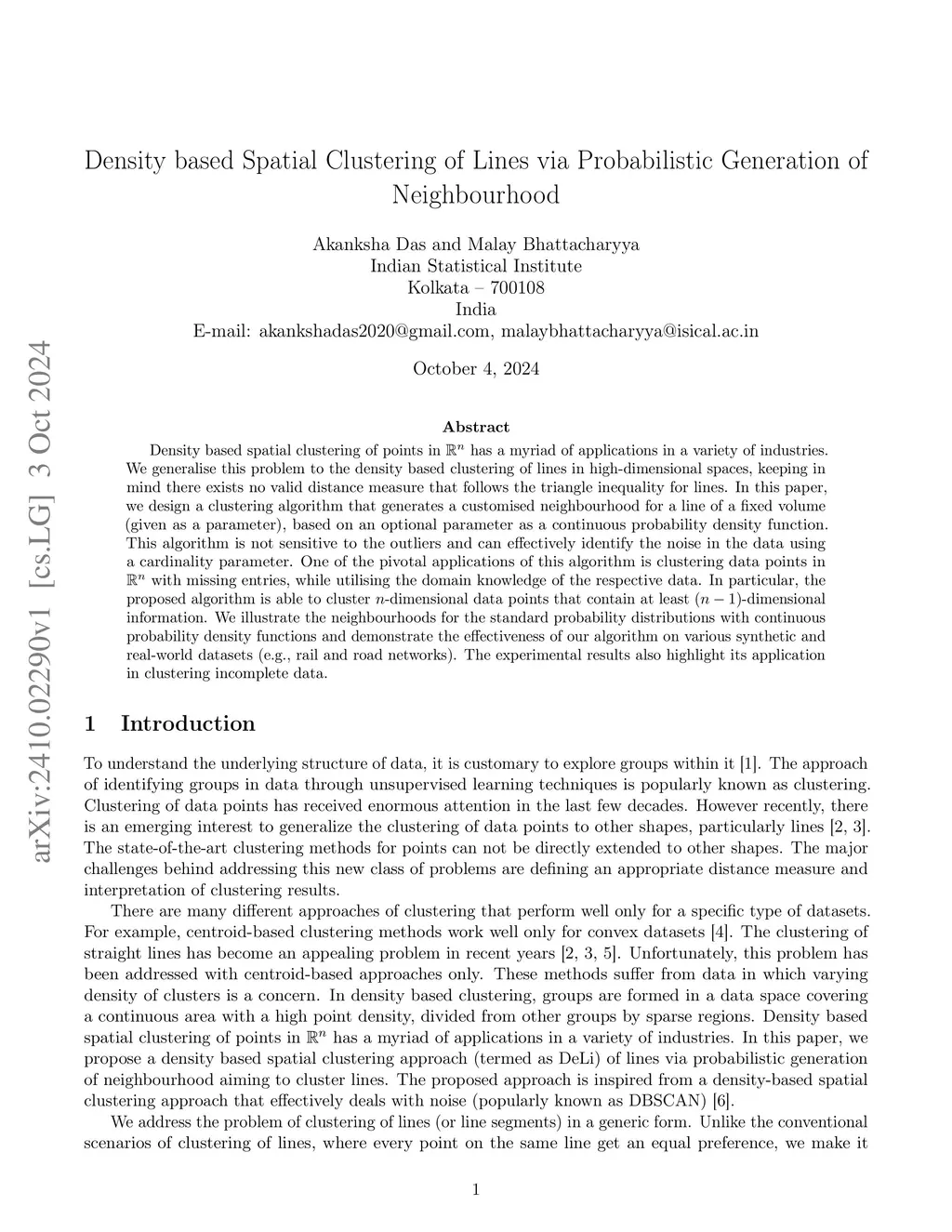 Density based spatial clustering of points in has a myriad of applications in a variety of industries. We generalise this problem to the density based clustering of lines in high-dimensional spaces, keeping in mind there exists no valid distance measure that follows the triangle inequality for lines. In this paper, we design a clustering algorithm that generates a customised neighbourhood for a line of a fixed volume (given as a parameter), based on an optional parameter as a continuous probability density function. This algorithm is not sensitive to the outliers and can effectively identify the noise in the data using a cardinality parameter. One of the pivotal applications of this algorithm is clustering data points in with missing entries, while utilising the domain knowledge of the respective data. In particular, the proposed algorithm is able to cluster -dimensional data points that contain at least -dimensional information. We illustrate the neighbourhoods for the standard probability distributions with continuous probability density functions and demonstrate the effectiveness of our algorithm on various synthetic and real-world datasets (e.g., rail and road networks). The experimental results also highlight its application in clustering incomplete data.