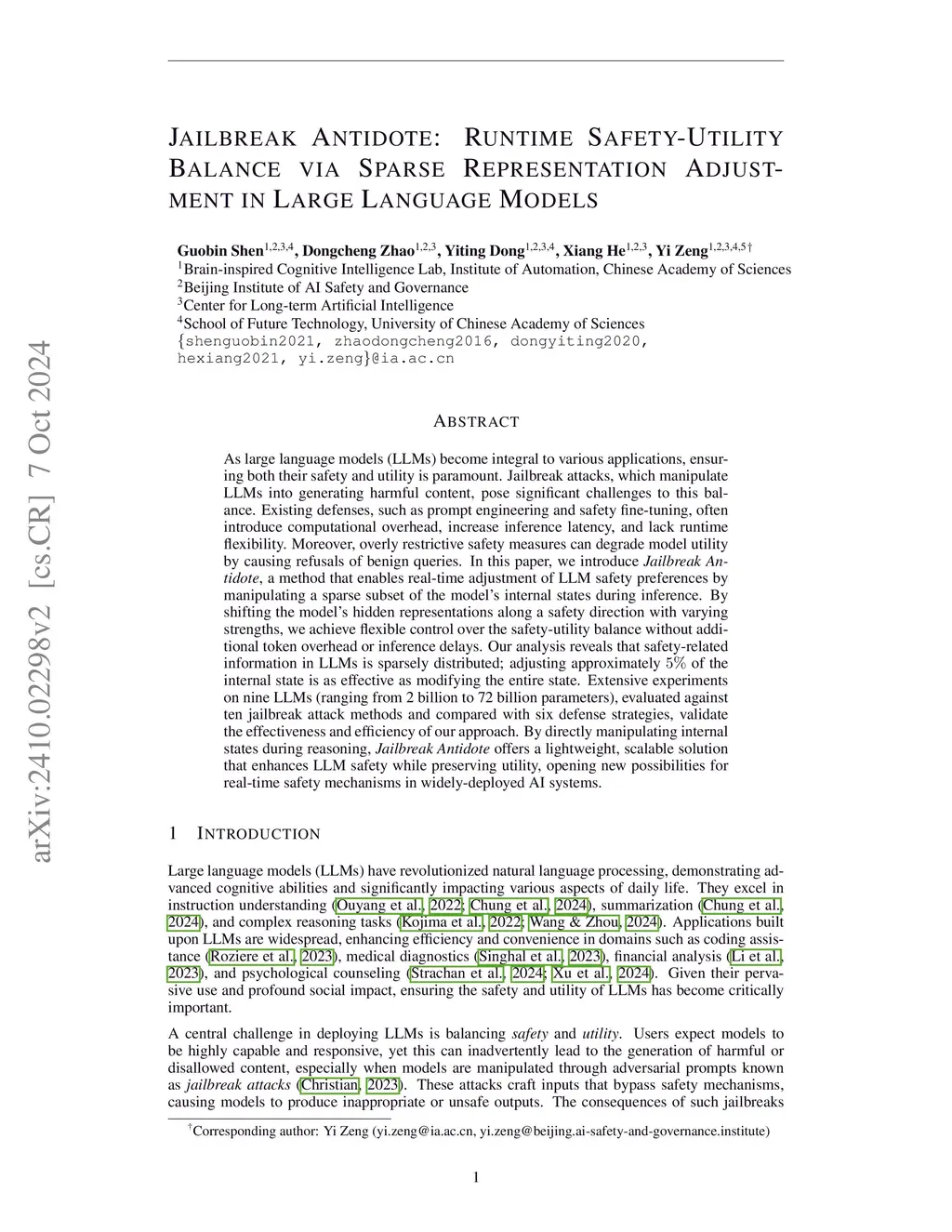 As large language models (LLMs) become integral to various applications, ensuring both their safety and utility is paramount. Jailbreak attacks, which manipulate LLMs into generating harmful content, pose significant challenges to this balance. Existing defenses, such as prompt engineering and safety fine-tuning, often introduce computational overhead, increase inference latency, and lack runtime flexibility. Moreover, overly restrictive safety measures can degrade model utility by causing refusals of benign queries. In this paper, we introduce Jailbreak Antidote, a method that enables real-time adjustment of LLM safety preferences by manipulating a sparse subset of the model's internal states during inference. By shifting the model's hidden representations along a safety direction with varying strengths, we achieve flexible control over the safety-utility balance without additional token overhead or inference delays. Our analysis reveals that safety-related information in LLMs is sparsely distributed; adjusting approximately 5% of the internal state is as effective as modifying the entire state. Extensive experiments on nine LLMs (ranging from 2 billion to 72 billion parameters), evaluated against ten jailbreak attack methods and compared with six defense strategies, validate the effectiveness and efficiency of our approach. By directly manipulating internal states during reasoning, Jailbreak Antidote offers a lightweight, scalable solution that enhances LLM safety while preserving utility, opening new possibilities for real-time safety mechanisms in widely-deployed AI systems.