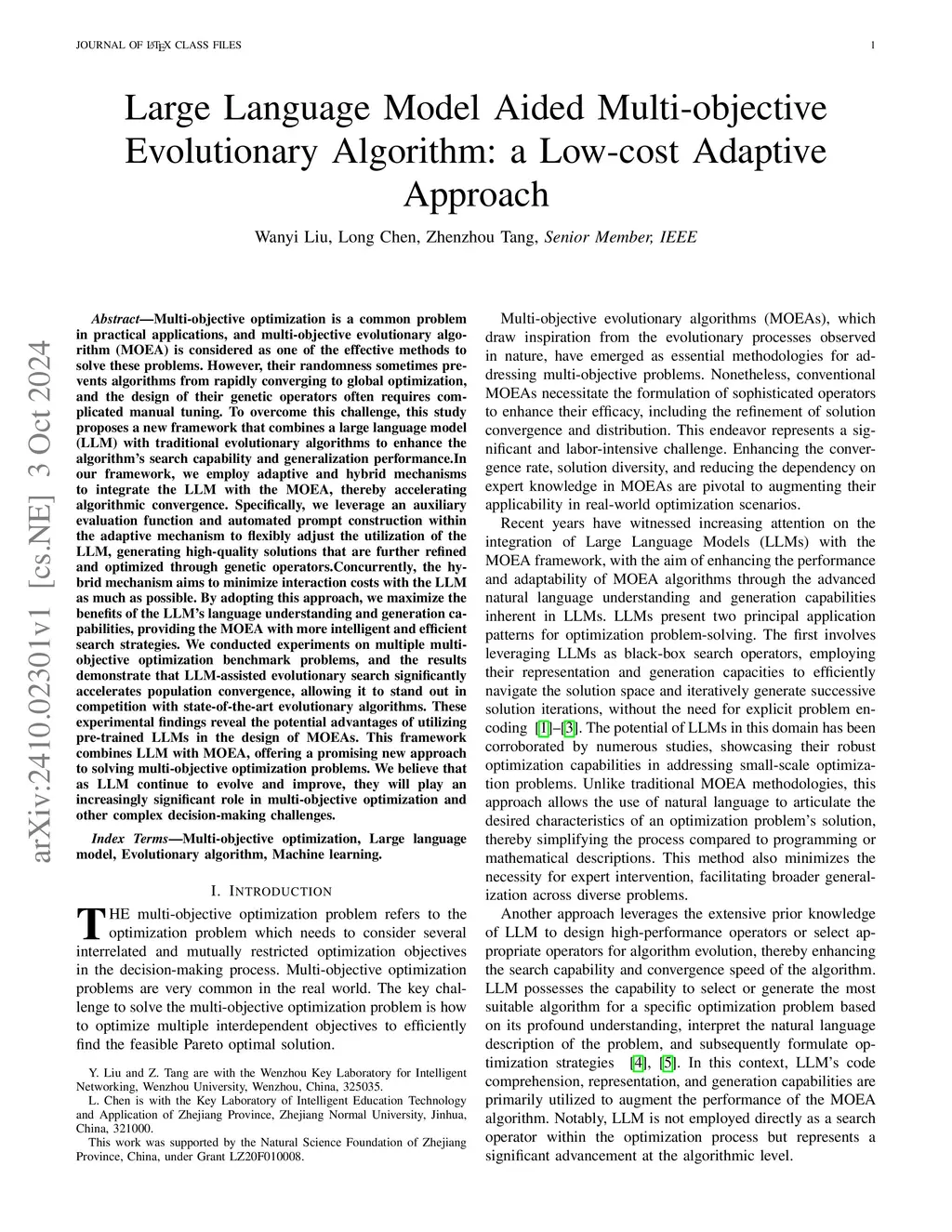 Multi-objective optimization is a common problem in practical applications, and multi-objective evolutionary algorithm (MOEA) is considered as one of the effective methods to solve these problems. However, their randomness sometimes prevents algorithms from rapidly converging to global optimization, and the design of their genetic operators often requires complicated manual tuning. To overcome this challenge, this study proposes a new framework that combines a large language model (LLM) with traditional evolutionary algorithms to enhance the algorithm's search capability and generalization performance.In our framework, we employ adaptive and hybrid mechanisms to integrate the LLM with the MOEA, thereby accelerating algorithmic convergence. Specifically, we leverage an auxiliary evaluation function and automated prompt construction within the adaptive mechanism to flexibly adjust the utilization of the LLM, generating high-quality solutions that are further refined and optimized through genetic operators.Concurrently, the hybrid mechanism aims to minimize interaction costs with the LLM as much as possible.