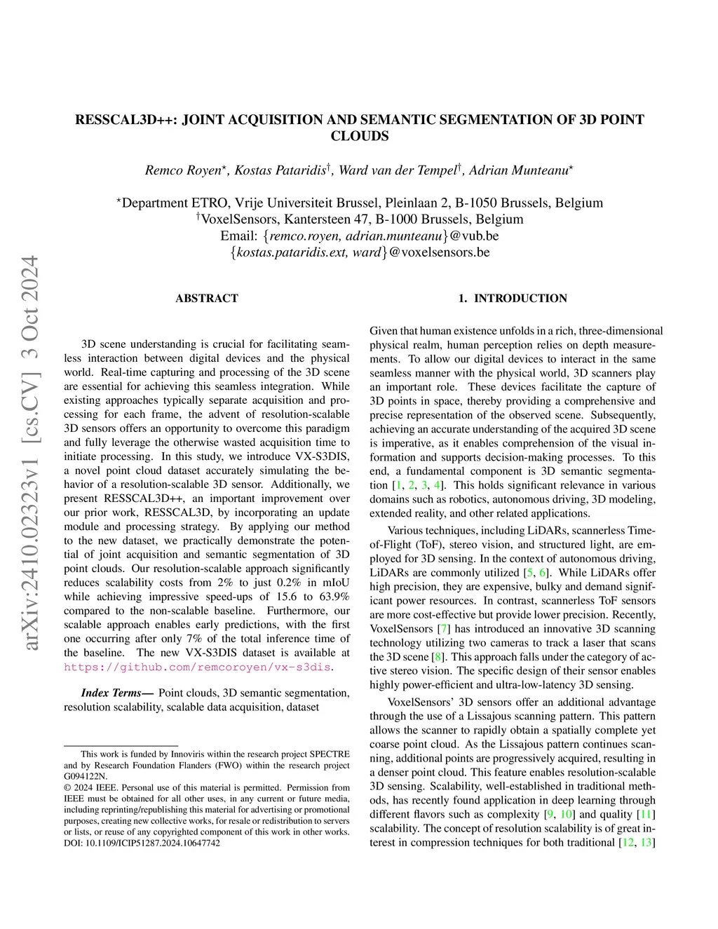 3D scene understanding is crucial for facilitating seamless interaction between digital devices and the physical world. Real-time capturing and processing of the 3D scene are essential for achieving this seamless integration. While existing approaches typically separate acquisition and processing for each frame, the advent of resolution-scalable 3D sensors offers an opportunity to overcome this paradigm and fully leverage the otherwise wasted acquisition time to initiate processing. In this study, we introduce VX-S3DIS, a novel point cloud dataset accurately simulating the behavior of a resolution-scalable 3D sensor. Additionally, we present RESSCAL3D++, an important improvement over our prior work, RESSCAL3D, by incorporating an update module and processing strategy. By applying our method to the new dataset, we practically demonstrate the potential of joint acquisition and semantic segmentation of 3D point clouds. Our resolution-scalable approach significantly reduces scalability costs from 2% to just 0.2% in mIoU while achieving impressive speed-ups of 15.6 to 63.9% compared to the non-scalable baseline. Furthermore, our scalable approach enables early predictions, with the first one occurring after only 7% of the total inference time of the baseline. The new VX-S3DIS dataset is available at https://github.com/remcoroyen/vx-s3dis.