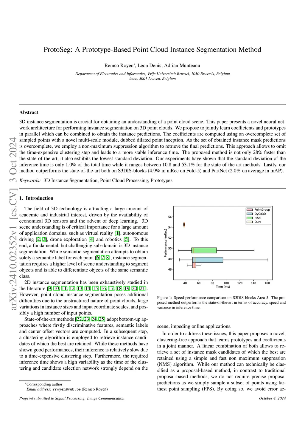 3D instance segmentation is crucial for obtaining an understanding of a point cloud scene. This paper presents a novel neural network architecture for performing instance segmentation on 3D point clouds. We propose to jointly learn coefficients and prototypes in parallel which can be combined to obtain the instance predictions. The coefficients are computed using an overcomplete set of sampled points with a novel multi-scale module, dubbed dilated point inception. As the set of obtained instance mask predictions is overcomplete, we employ a non-maximum suppression algorithm to retrieve the final predictions. This approach allows to omit the time-expensive clustering step and leads to a more stable inference time. The proposed method is not only 28% faster than the state-of-the-art, it also exhibits the lowest standard deviation. Our experiments have shown that the standard deviation of the inference time is only 1.0% of the total time while it ranges between 10.8 and 53.1% for the state-of-the-art methods. Lastly, our method outperforms the state-of-the-art both on S3DIS-blocks (4.9% in mRec on Fold-5) and PartNet (2.0% on average in mAP).