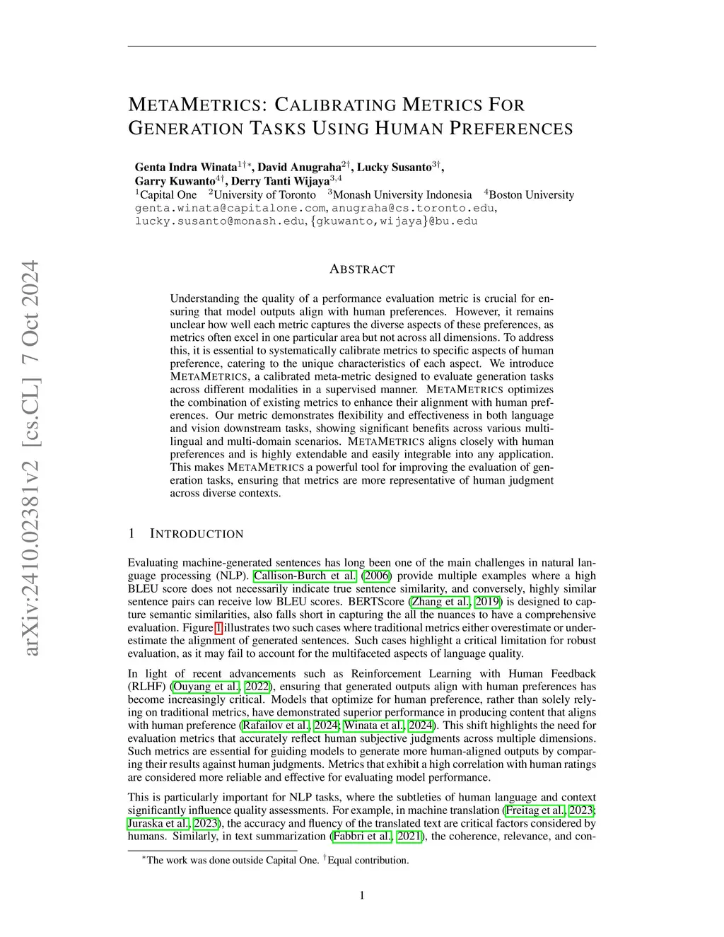 Understanding the quality of a performance evaluation metric is crucial for ensuring that model outputs align with human preferences. However, it remains unclear how well each metric captures the diverse aspects of these preferences, as metrics often excel in one particular area but not across all dimensions. To address this, it is essential to systematically calibrate metrics to specific aspects of human preference, catering to the unique characteristics of each aspect. We introduce MetaMetrics, a calibrated meta-metric designed to evaluate generation tasks across different modalities in a supervised manner. MetaMetrics optimizes the combination of existing metrics to enhance their alignment with human preferences. Our metric demonstrates flexibility and effectiveness in both language and vision downstream tasks, showing significant benefits across various multilingual and multi-domain scenarios. MetaMetrics aligns closely with human preferences and is highly extendable and easily integrable into any application. This makes MetaMetrics a powerful tool for improving the evaluation of generation tasks, ensuring that metrics are more representative of human judgment across diverse contexts.