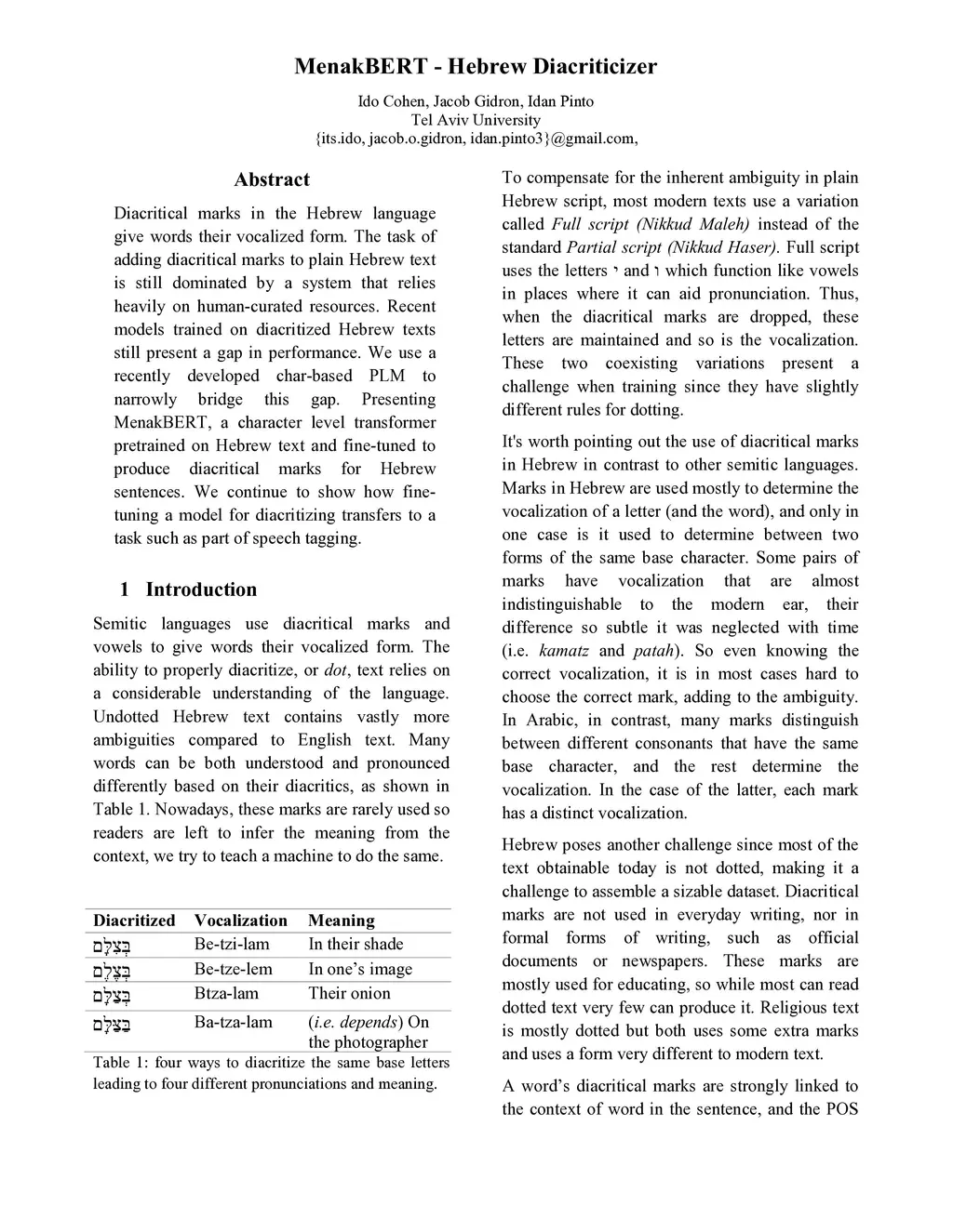 Diacritical marks in the Hebrew language give words their vocalized form. The task of adding diacritical marks to plain Hebrew text is still dominated by a system that relies heavily on human-curated resources. Recent models trained on diacritized Hebrew texts still present a gap in performance. We use a recently developed char-based PLM to narrowly bridge this gap. Presenting MenakBERT, a character level transformer pretrained on Hebrew text and fine-tuned to produce diacritical marks for Hebrew sentences. We continue to show how finetuning a model for diacritizing transfers to a task such as part of speech tagging.