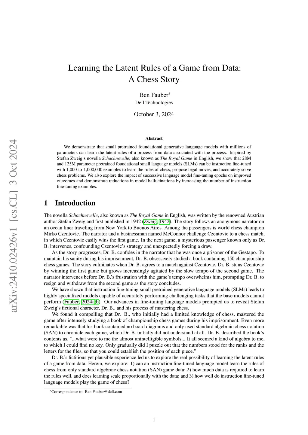 We demonstrate that small pretrained foundational generative language models with millions of parameters can learn the latent rules of a process from data associated with the process. Inspired by Stefan Zweig's novella "Schachnovelle," also known as "The Royal Game" in English, we show that 28M and 125M parameter pretrained foundational small language models (SLMs) can be instruction fine-tuned with 1,000-to-1,000,000 examples to learn the rules of chess, propose legal moves, and accurately solve chess problems. We also explore the impact of successive language model fine-tuning epochs on improved outcomes and demonstrate reductions in model hallucinations by increasing the number of instruction fine-tuning examples.
