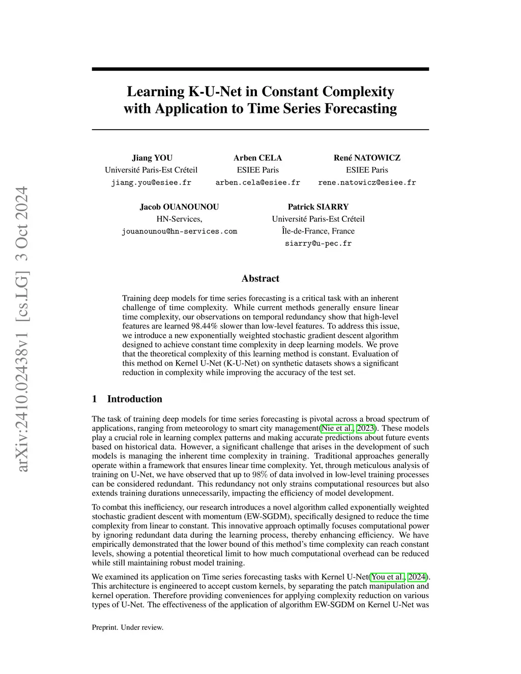Training deep models for time series forecasting is a critical task with an inherent challenge of time complexity. While current methods generally ensure linear time complexity, our observations on temporal redundancy show that high-level features are learned 98.44\% slower than low-level features. To address this issue, we introduce a new exponentially weighted stochastic gradient descent algorithm designed to achieve constant time complexity in deep learning models. We prove that the theoretical complexity of this learning method is constant. Evaluation of this method on Kernel U-Net (K-U-Net) on synthetic datasets shows a significant reduction in complexity while improving the accuracy of the test set.