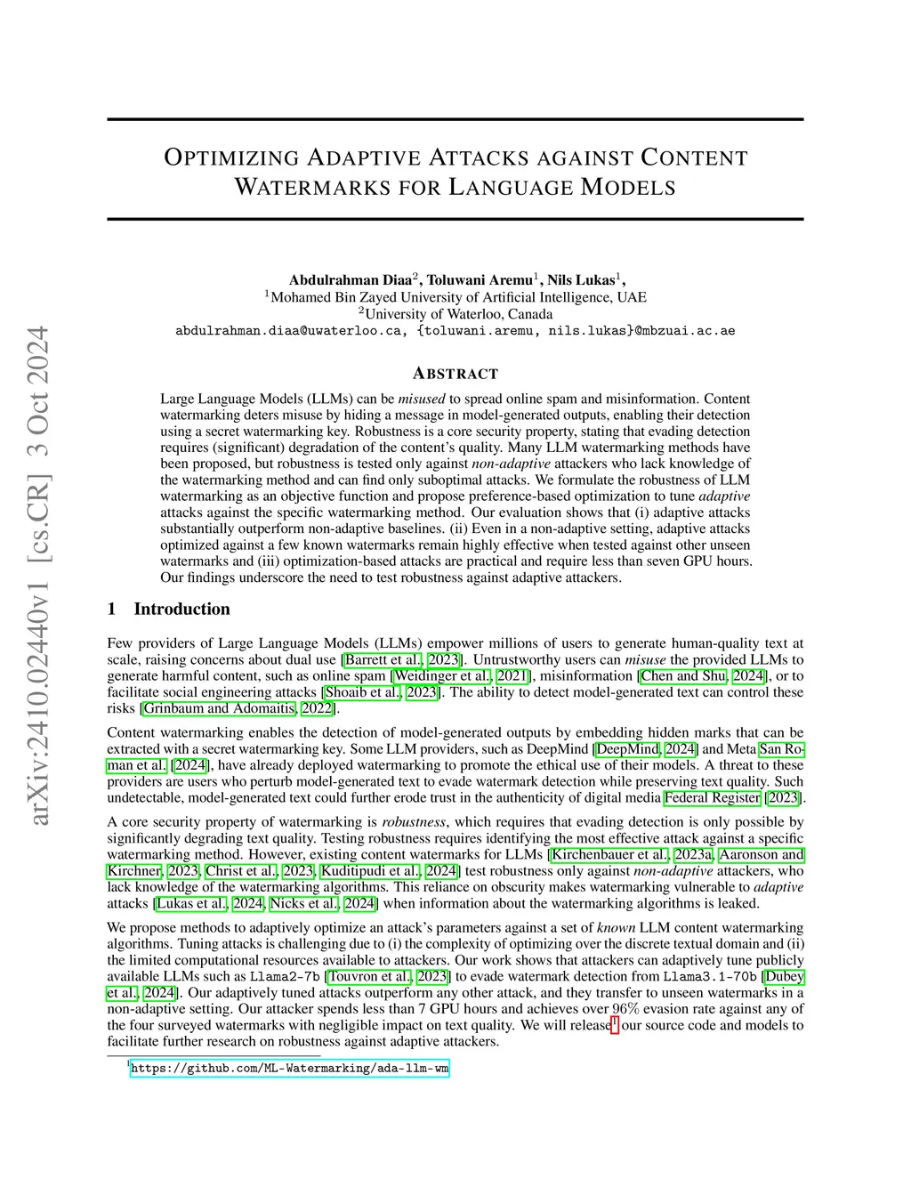 Large Language Models (LLMs) can be misused to spread unwanted content at scale. Content watermarking deters misuse by hiding messages in content, enabling its detection using a secret watermarking key. Robustness is a core security property, stating that evading detection requires (significant) degradation of the content's quality. Many LLM watermarking methods have been proposed, but robustness is tested only against non-adaptive attackers who lack knowledge of the watermarking method and can find only suboptimal attacks. We formulate watermark robustness as an objective function and use preference-based optimization to tune adaptive attacks against the specific watermarking method. Our evaluation shows that (i) adaptive attacks evade detection against all surveyed watermarks, (ii) training against any watermark succeeds in evading unseen watermarks, and (iii) optimization-based attacks are cost-effective. Our findings underscore the need to test robustness against adaptively tuned attacks. We release our adaptively optimized paraphrasers atthis https URL.