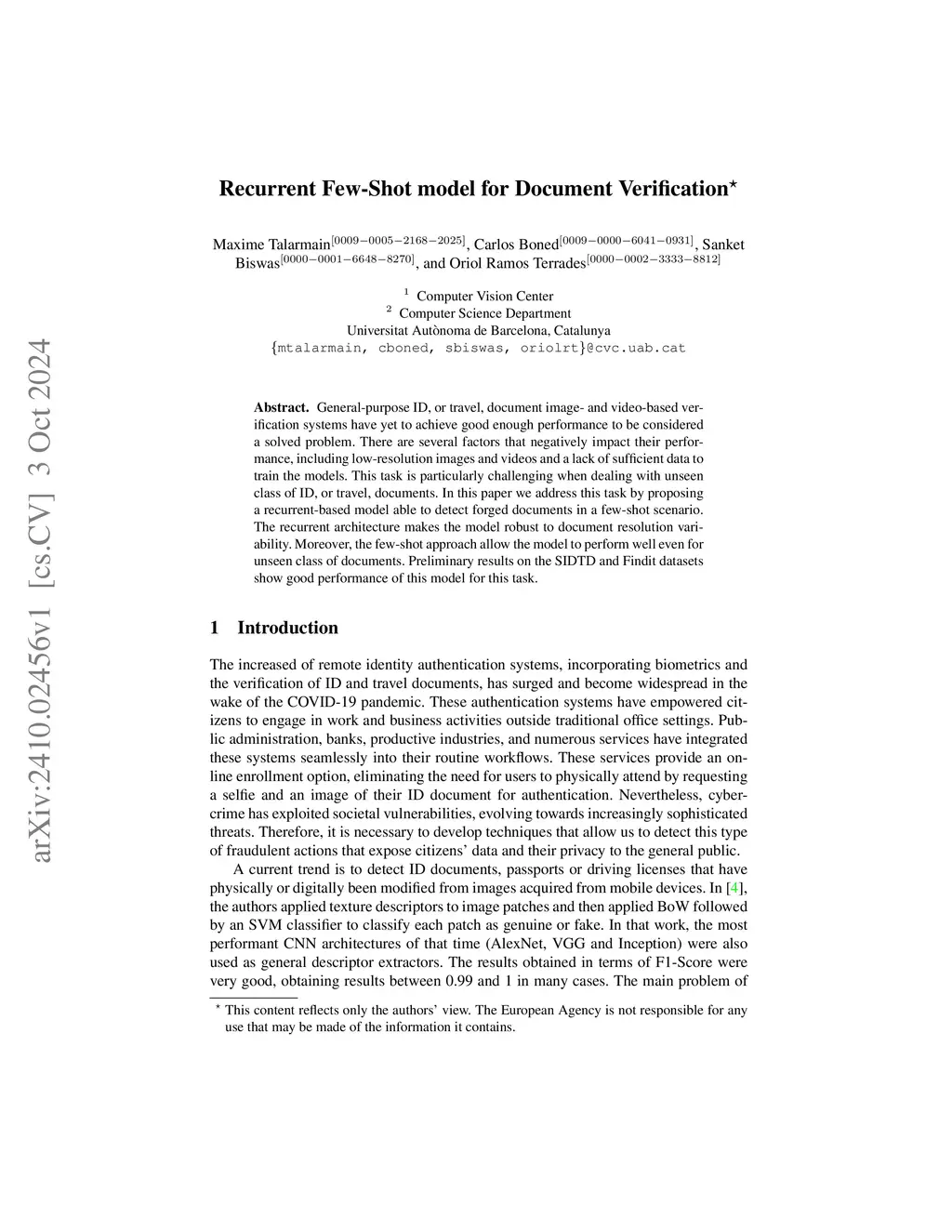 General-purpose ID, or travel, document image- and video-based verification systems have yet to achieve good enough performance to be considered a solved problem. There are several factors that negatively impact their performance, including low-resolution images and videos and a lack of sufficient data to train the models. This task is particularly challenging when dealing with unseen class of ID, or travel, documents. In this paper we address this task by proposing a recurrent-based model able to detect forged documents in a few-shot scenario. The recurrent architecture makes the model robust to document resolution variability. Moreover, the few-shot approach allow the model to perform well even for unseen class of documents. Preliminary results on the SIDTD and Findit datasets show good performance of this model for this task.