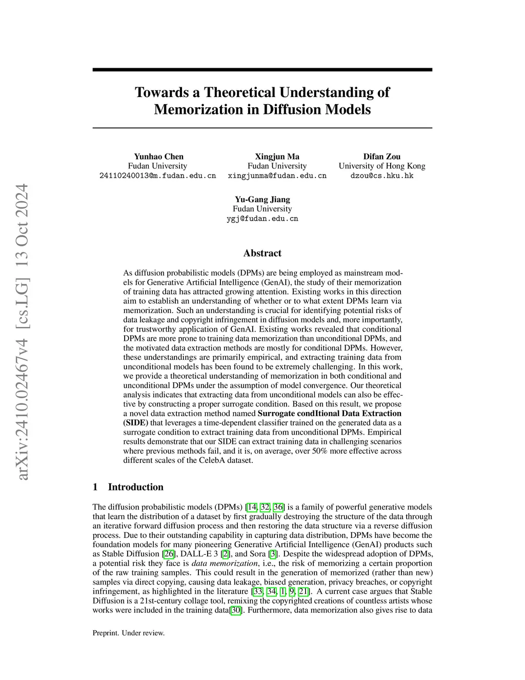As diffusion probabilistic models (DPMs) are being employed as mainstream models for Generative Artificial Intelligence (GenAI), the study of their memorization of training data has attracted growing attention. Existing works in this direction aim to establish an understanding of whether or to what extent DPMs learn via memorization. Such an understanding is crucial for identifying potential risks of data leakage and copyright infringement in diffusion models and, more importantly, for trustworthy application of GenAI. Existing works revealed that conditional DPMs are more prone to training data memorization than unconditional DPMs, and the motivated data extraction methods are mostly for conditional DPMs. However, these understandings are primarily empirical, and extracting training data from unconditional models has been found to be extremely challenging. In this work, we provide a theoretical understanding of memorization in both conditional and unconditional DPMs under the assumption of model convergence. Our theoretical analysis indicates that extracting data from unconditional models can also be effective by constructing a proper surrogate condition. Based on this result, we propose a novel data extraction method named \textbf{Surrogate condItional Data Extraction (SIDE)} that leverages a time-dependent classifier trained on the generated data as a surrogate condition to extract training data from unconditional DPMs. Empirical results demonstrate that our SIDE can extract training data in challenging scenarios where previous methods fail, and it is, on average, over 50\% more effective across different scales of the CelebA dataset.