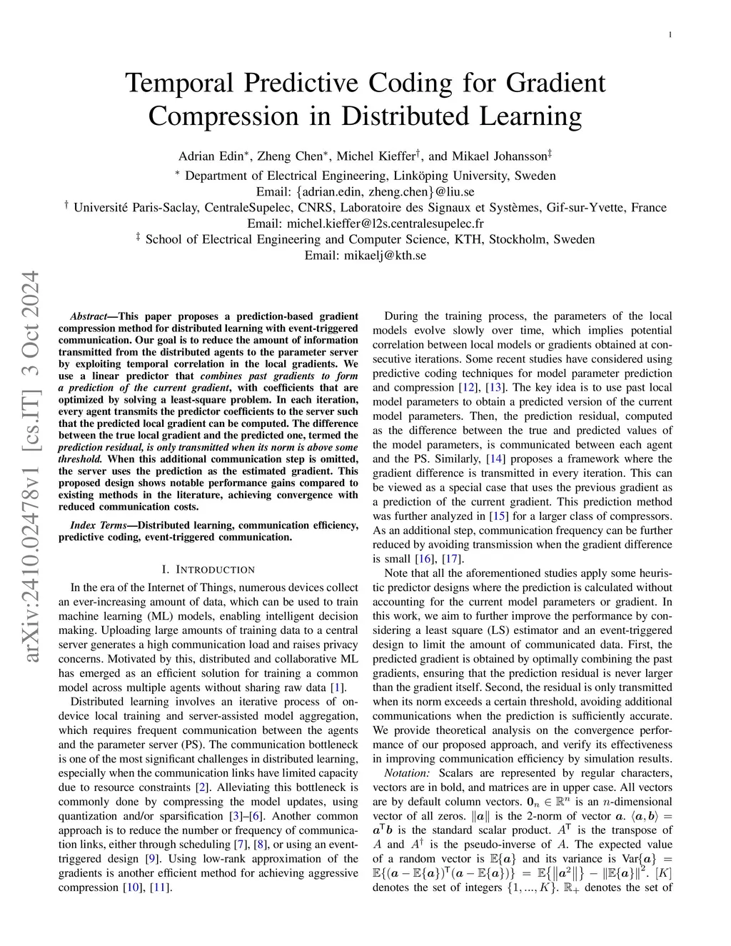 This paper proposes a prediction-based gradient compression method for distributed learning with event-triggered communication. Our goal is to reduce the amount of information transmitted from the distributed agents to the parameter server by exploiting temporal correlation in the local gradients. We use a linear predictor that \textit{combines past gradients to form a prediction of the current gradient}, with coefficients that are optimized by solving a least-square problem. In each iteration, every agent transmits the predictor coefficients to the server such that the predicted local gradient can be computed. The difference between the true local gradient and the predicted one, termed the \textit{prediction residual, is only transmitted when its norm is above some threshold.} When this additional communication step is omitted, the server uses the prediction as the estimated gradient. This proposed design shows notable performance gains compared to existing methods in the literature, achieving convergence with reduced communication costs.