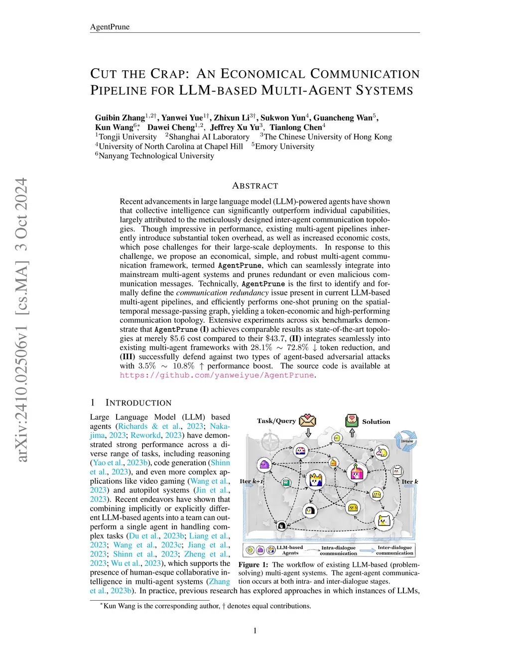 Recent advancements in large language model (LLM)-powered agents have shown that collective intelligence can significantly outperform individual capabilities, largely attributed to the meticulously designed inter-agent communication topologies. Though impressive in performance, existing multi-agent pipelines inherently introduce substantial token overhead, as well as increased economic costs, which pose challenges for their large-scale deployments. In response to this challenge, we propose an economical, simple, and robust multi-agent communication framework, termed , which can seamlessly integrate into mainstream multi-agent systems and prunes redundant or even malicious communication messages. Technically, is the first to identify and formally define the \textit{communication redundancy} issue present in current LLM-based multi-agent pipelines, and efficiently performs one-shot pruning on the spatial-temporal message-passing graph, yielding a token-economic and high-performing communication topology. Extensive experiments across six benchmarks demonstrate that \textbf{(I)} achieves comparable results as state-of-the-art topologies at merely \5.6$ cost compared to their \43.7$, \textbf{(II)} integrates seamlessly into existing multi-agent frameworks with token reduction, and \textbf{(III)} successfully defend against two types of agent-based adversarial attacks with performance boost.