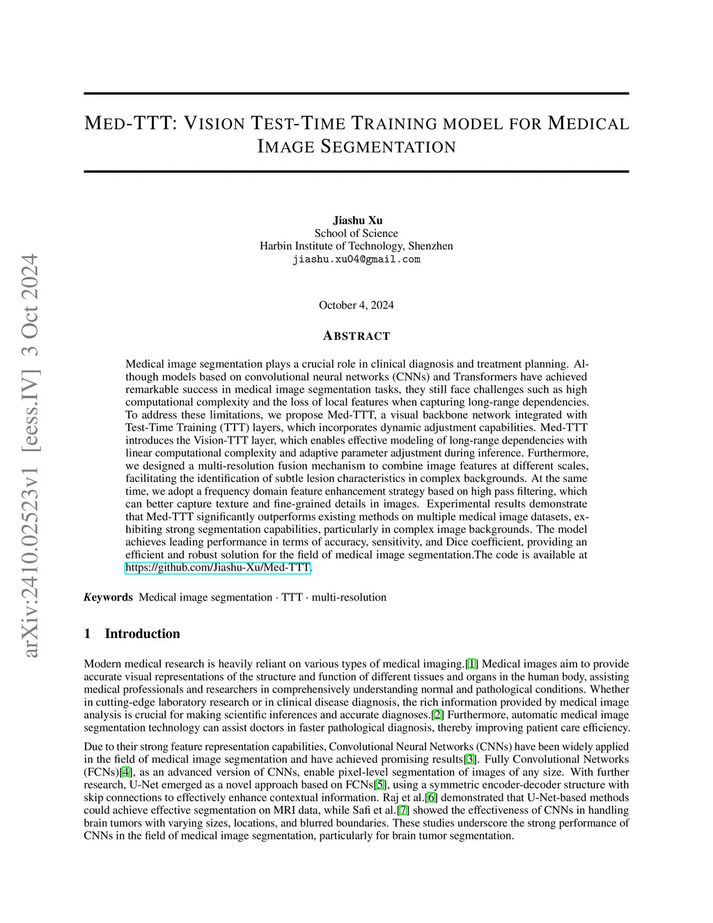 Medical image segmentation plays a crucial role in clinical diagnosis and treatment planning. Although models based on convolutional neural networks (CNNs) and Transformers have achieved remarkable success in medical image segmentation tasks, they still face challenges such as high computational complexity and the loss of local features when capturing long-range dependencies. To address these limitations, we propose Med-TTT, a visual backbone network integrated with Test-Time Training (TTT) layers, which incorporates dynamic adjustment capabilities. Med-TTT introduces the Vision-TTT layer, which enables effective modeling of long-range dependencies with linear computational complexity and adaptive parameter adjustment during inference. Furthermore, we designed a multi-resolution fusion mechanism to combine image features at different scales, facilitating the identification of subtle lesion characteristics in complex backgrounds. At the same time, we adopt a frequency domain feature enhancement strategy based on high pass filtering, which can better capture texture and fine-grained details in images. Experimental results demonstrate that Med-TTT significantly outperforms existing methods on multiple medical image datasets, exhibiting strong segmentation capabilities, particularly in complex image backgrounds. The model achieves leading performance in terms of accuracy, sensitivity, and Dice coefficient, providing an efficient and robust solution for the field of medical image segmentation.The code is available at https://github.com/Jiashu-Xu/Med-TTT .
