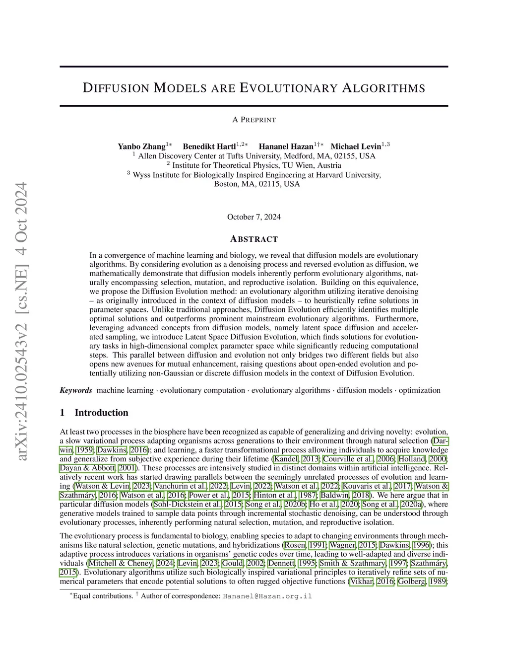 In a convergence of machine learning and biology, we reveal that diffusion models are evolutionary algorithms. By considering evolution as a denoising process and reversed evolution as diffusion, we mathematically demonstrate that diffusion models inherently perform evolutionary algorithms, naturally encompassing selection, mutation, and reproductive isolation. Building on this equivalence, we propose the Diffusion Evolution method: an evolutionary algorithm utilizing iterative denoising -- as originally introduced in the context of diffusion models -- to heuristically refine solutions in parameter spaces. Unlike traditional approaches, Diffusion Evolution efficiently identifies multiple optimal solutions and outperforms prominent mainstream evolutionary algorithms. Furthermore, leveraging advanced concepts from diffusion models, namely latent space diffusion and accelerated sampling, we introduce Latent Space Diffusion Evolution, which finds solutions for evolutionary tasks in high-dimensional complex parameter space while significantly reducing computational steps. This parallel between diffusion and evolution not only bridges two different fields but also opens new avenues for mutual enhancement, raising questions about open-ended evolution and potentially utilizing non-Gaussian or discrete diffusion models in the context of Diffusion Evolution.