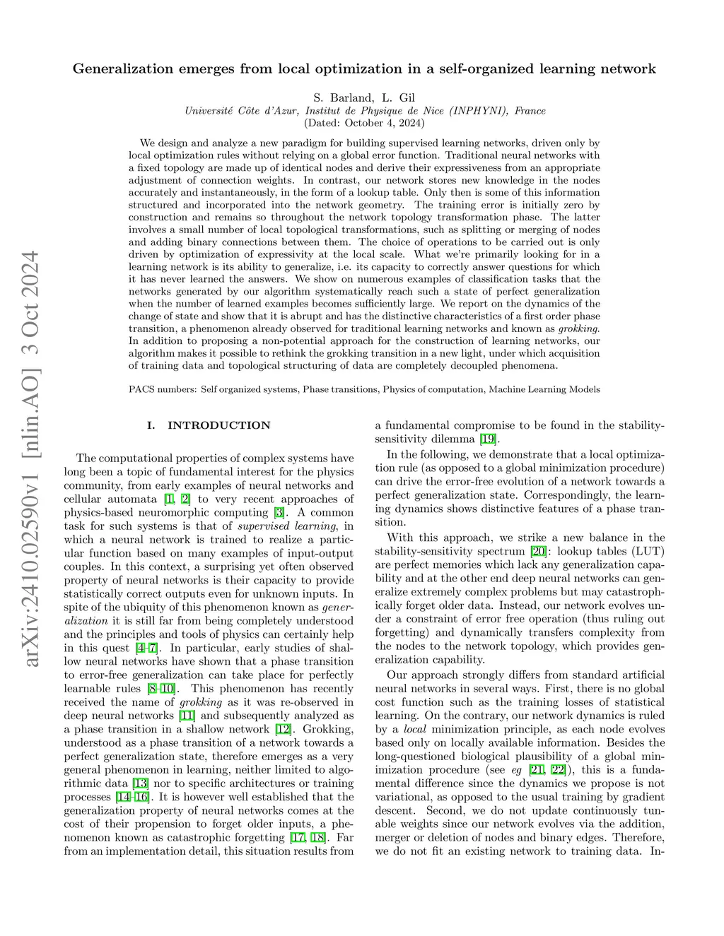 We design and analyze a new paradigm for building supervised learning networks, driven only by local optimization rules without relying on a global error function. Traditional neural networks with a fixed topology are made up of identical nodes and derive their expressiveness from an appropriate adjustment of connection weights. In contrast, our network stores new knowledge in the nodes accurately and instantaneously, in the form of a lookup table. Only then is some of this information structured and incorporated into the network geometry. The training error is initially zero by construction and remains so throughout the network topology transformation phase. The latter involves a small number of local topological transformations, such as splitting or merging of nodes and adding binary connections between them. The choice of operations to be carried out is only driven by optimization of expressivity at the local scale. What we are primarily looking for in a learning network is its ability to generalize, i.e. its capacity to correctly answer questions for which it has never learned the answers. We show on numerous examples of classification tasks that the networks generated by our algorithm systematically reach such a state of perfect generalization when the number of learned examples becomes sufficiently large. We report on the dynamics of the change of state and show that it is abrupt and has the distinctive characteristics of a first order phase transition, a phenomenon already observed for traditional learning networks and known as grokking. In addition to proposing a non-potential approach for the construction of learning networks, our algorithm makes it possible to rethink the grokking transition in a new light, under which acquisition of training data and topological structuring of data are completely decoupled phenomena.
