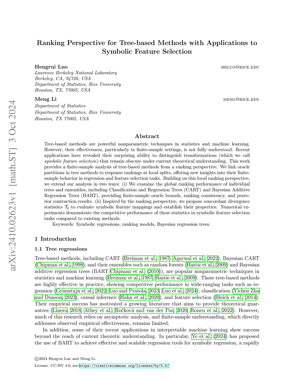 Tree-based methods are powerful nonparametric techniques in statistics and machine learning. However, their effectiveness, particularly in finite-sample settings, is not fully understood. Recent applications have revealed their surprising ability to distinguish transformations (which we call symbolic feature selection) that remain obscure under current theoretical understanding. This work provides a finite-sample analysis of tree-based methods from a ranking perspective. We link oracle partitions in tree methods to response rankings at local splits, offering new insights into their finite-sample behavior in regression and feature selection tasks. Building on this local ranking perspective, we extend our analysis in two ways: (i) We examine the global ranking performance of individual trees and ensembles, including Classification and Regression Trees (CART) and Bayesian Additive Regression Trees (BART), providing finite-sample oracle bounds, ranking consistency, and posterior contraction results. (ii) Inspired by the ranking perspective, we propose concordant divergence statistics to evaluate symbolic feature mappings and establish their properties. Numerical experiments demonstrate the competitive performance of these statistics in symbolic feature selection tasks compared to existing methods.