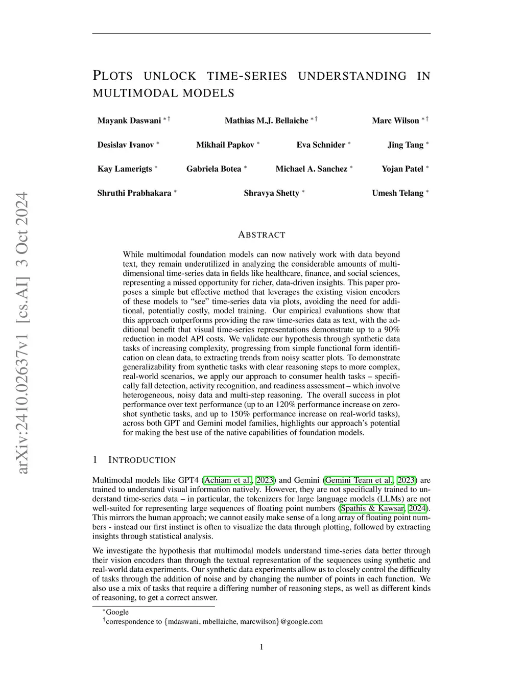 While multimodal foundation models can now natively work with data beyond text, they remain underutilized in analyzing the considerable amounts of multi-dimensional time-series data in fields like healthcare, finance, and social sciences, representing a missed opportunity for richer, data-driven insights. This paper proposes a simple but effective method that leverages the existing vision encoders of these models to "see" time-series data via plots, avoiding the need for additional, potentially costly, model training. Our empirical evaluations show that this approach outperforms providing the raw time-series data as text, with the additional benefit that visual time-series representations demonstrate up to a 90% reduction in model API costs. We validate our hypothesis through synthetic data tasks of increasing complexity, progressing from simple functional form identification on clean data, to extracting trends from noisy scatter plots. To demonstrate generalizability from synthetic tasks with clear reasoning steps to more complex, real-world scenarios, we apply our approach to consumer health tasks - specifically fall detection, activity recognition, and readiness assessment - which involve heterogeneous, noisy data and multi-step reasoning. The overall success in plot performance over text performance (up to an 120% performance increase on zero-shot synthetic tasks, and up to 150% performance increase on real-world tasks), across both GPT and Gemini model families, highlights our approach's potential for making the best use of the native capabilities of foundation models.