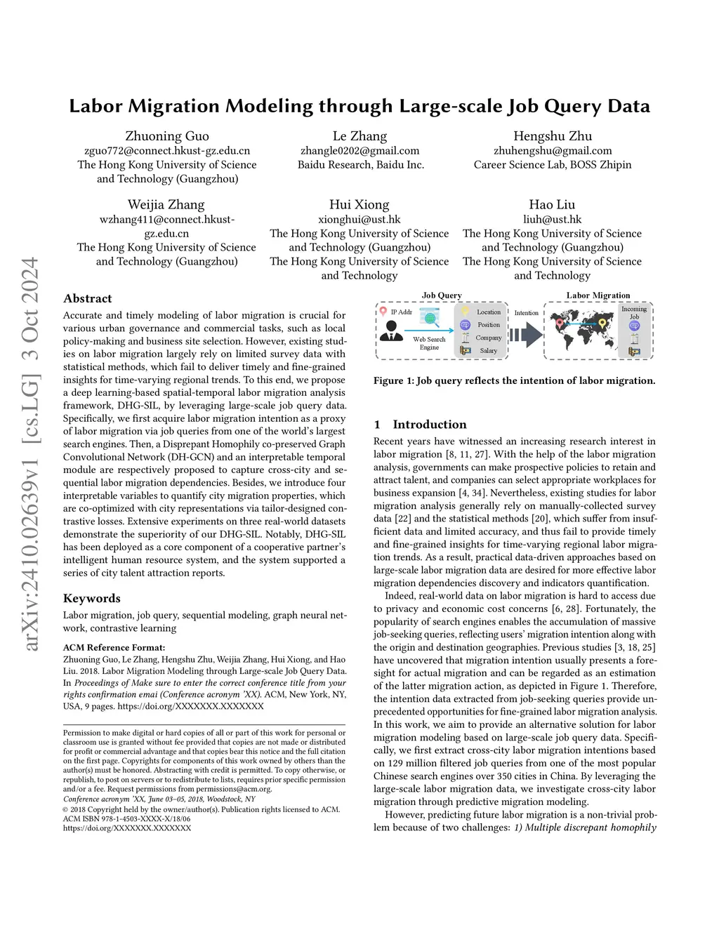 Accurate and timely modeling of labor migration is crucial for various urban governance and commercial tasks, such as local policy-making and business site selection. However, existing studies on labor migration largely rely on limited survey data with statistical methods, which fail to deliver timely and fine-grained insights for time-varying regional trends. To this end, we propose a deep learning-based spatial-temporal labor migration analysis framework, DHG-SIL, by leveraging large-scale job query data. Specifically, we first acquire labor migration intention as a proxy of labor migration via job queries from one of the world's largest search engines. Then, a Disprepant Homophily co-preserved Graph Convolutional Network (DH-GCN) and an interpretable temporal module are respectively proposed to capture cross-city and sequential labor migration dependencies. Besides, we introduce four interpretable variables to quantify city migration properties, which are co-optimized with city representations via tailor-designed contrastive losses. Extensive experiments on three real-world datasets demonstrate the superiority of our DHG-SIL. Notably, DHG-SIL has been deployed as a core component of a cooperative partner's intelligent human resource system, and the system supported a series of city talent attraction reports.