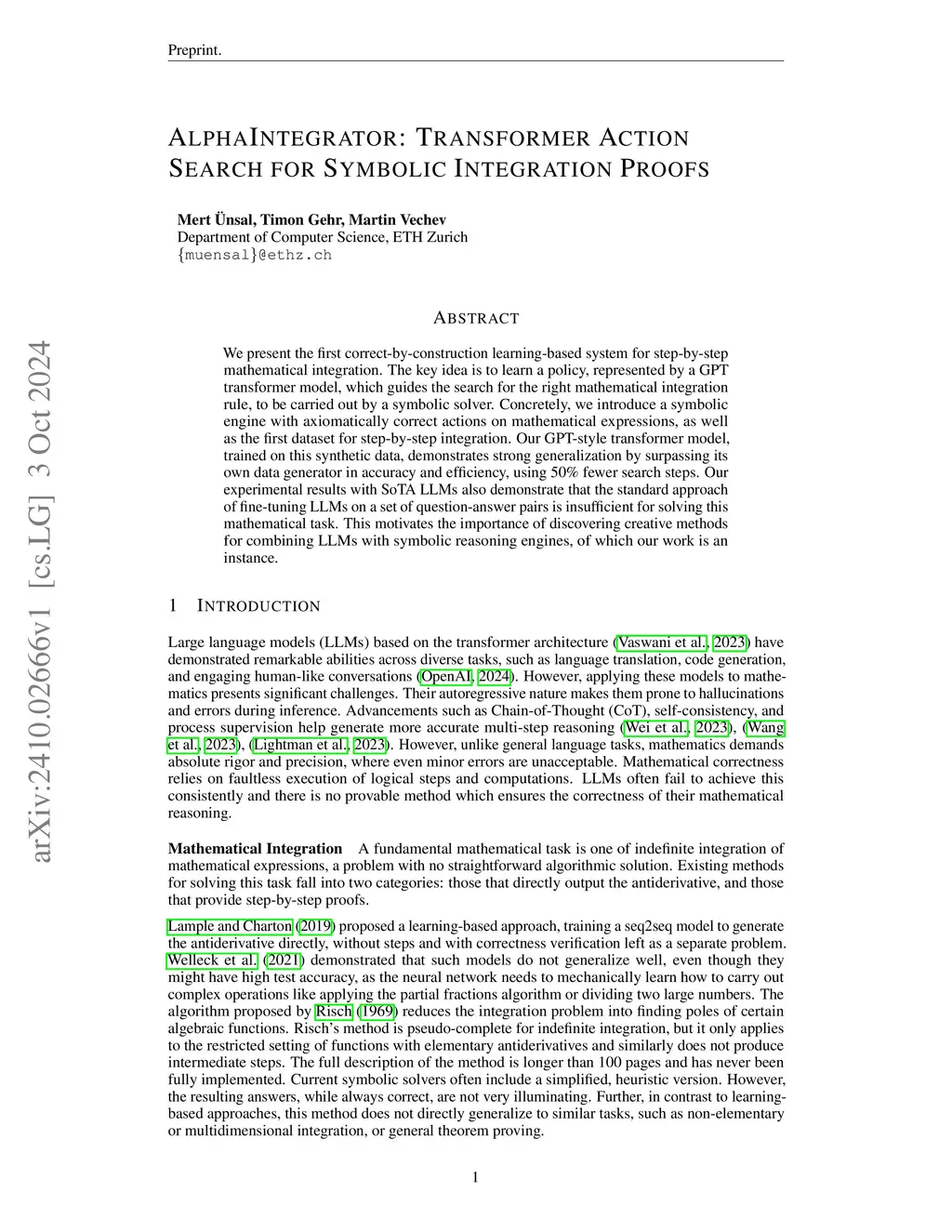 We present the first correct-by-construction learning-based system for step-by-step mathematical integration. The key idea is to learn a policy, represented by a GPT transformer model, which guides the search for the right mathematical integration rule, to be carried out by a symbolic solver. Concretely, we introduce a symbolic engine with axiomatically correct actions on mathematical expressions, as well as the first dataset for step-by-step integration. Our GPT-style transformer model, trained on this synthetic data, demonstrates strong generalization by surpassing its own data generator in accuracy and efficiency, using 50% fewer search steps. Our experimental results with SoTA LLMs also demonstrate that the standard approach of fine-tuning LLMs on a set of question-answer pairs is insufficient for solving this mathematical task. This motivates the importance of discovering creative methods for combining LLMs with symbolic reasoning engines, of which our work is an instance.