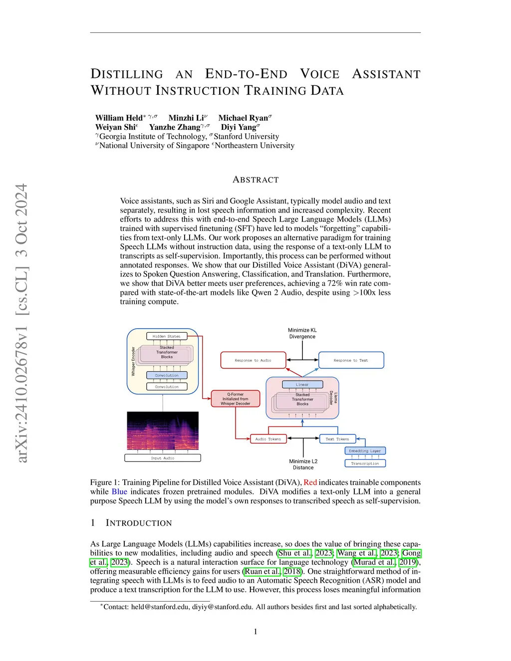 Voice assistants, such as Siri and Google Assistant, typically model audio and text separately, resulting in lost speech information and increased complexity. Recent efforts to address this with end-to-end Speech Large Language Models (LLMs) trained with supervised finetuning (SFT) have led to models ``forgetting" capabilities from text-only LLMs. Our work proposes an alternative paradigm for training Speech LLMs without instruction data, using the response of a text-only LLM to transcripts as self-supervision. Importantly, this process can be performed without annotated responses. We show that our Distilled Voice Assistant (DiVA) generalizes to Spoken Question Answering, Classification, and Translation. Furthermore, we show that DiVA better meets user preferences, achieving a 72\% win rate compared with state-of-the-art models like Qwen 2 Audio, despite using 100x less training compute.