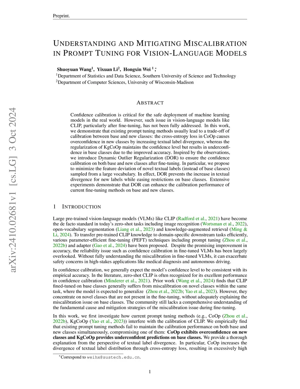 Confidence calibration is critical for the safe deployment of machine learning models in the real world. However, such issue in vision-language models like CLIP, particularly after fine-tuning, has not been fully addressed. In this work, we demonstrate that existing prompt tuning methods usually lead to a trade-off of calibration between base and new classes: the cross-entropy loss in CoOp causes overconfidence in new classes by increasing textual label divergence, whereas the regularization of KgCoOp maintains the confidence level but results in underconfidence in base classes due to the improved accuracy. Inspired by the observations, we introduce Dynamic Outlier Regularization (DOR) to ensure the confidence calibration on both base and new classes after fine-tuning. In particular, we propose to minimize the feature deviation of novel textual labels (instead of base classes) sampled from a large vocabulary. In effect, DOR prevents the increase in textual divergence for new labels while easing restrictions on base classes. Extensive experiments demonstrate that DOR can enhance the calibration performance of current fine-tuning methods on base and new classes.